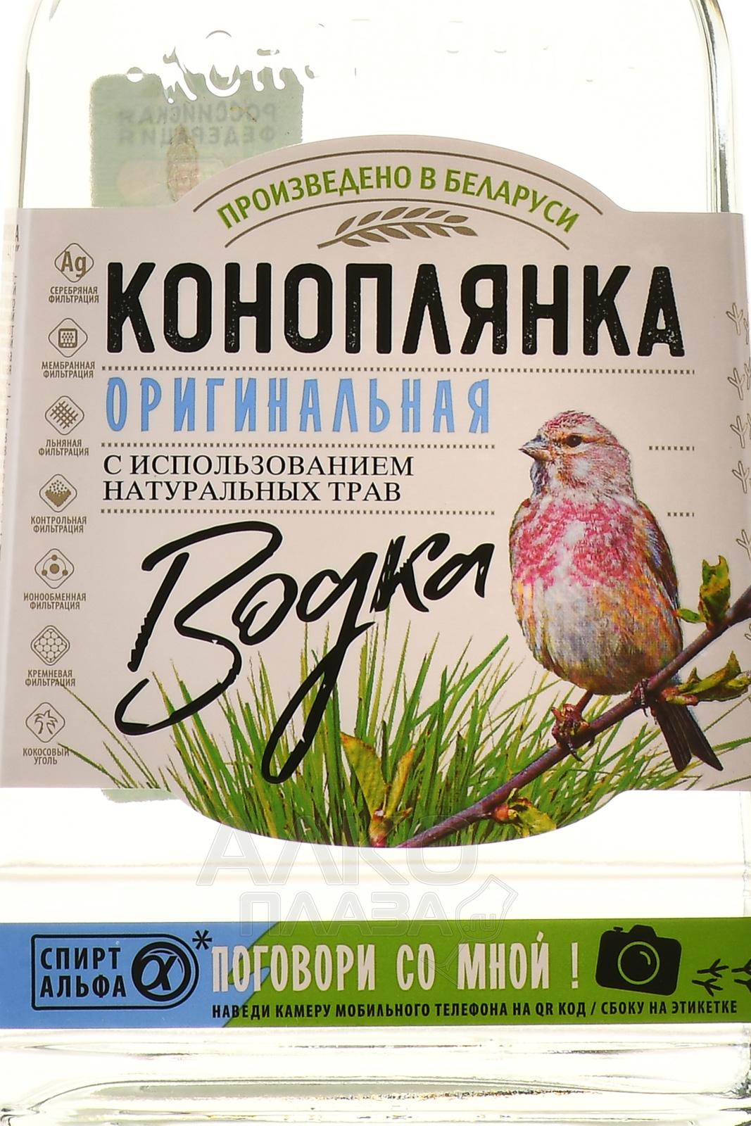 Водка Коноплянка Оригинальная 0.5 л — ароматизированная белорусская водка, которая проходит 7 степеней очистки, с уровнем спиртуозности 40 градусов от крупной компании Минск Кристалл, создана из качественного спирта «Альфа» и натуральных настоев трав — это душица, чабрец и эхинацея пурпурная. Кремниевая и льняная фильтрации отвечают за привлекательный блеск и приятный вкусоаромат напитка. Птичка коноплянка красуется на этикетке каждой бутылки.