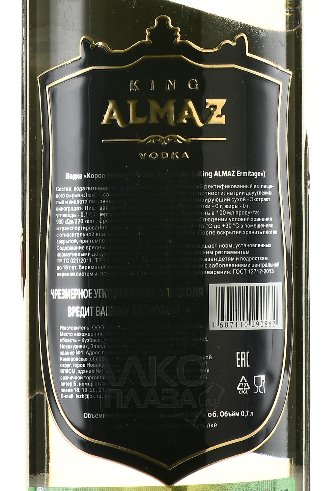 Водка Королевский АЛМАЗ Эрмитаж 0,7 л в п/у подходит на роль подарка по любому поводу. Алкоголь премиального уровня привлекает внимание стильным подарочным оформлением. Главный ингредиент – спирт высокой степени очистки категории «Люкс». Оригинальная добавка – натуральный виноградный экстракт, придающий необычные нюансы вкусу и аромату. Также используется инновационный углеродный модуль «Алкософт», улучшающий дегустационные качества водки.