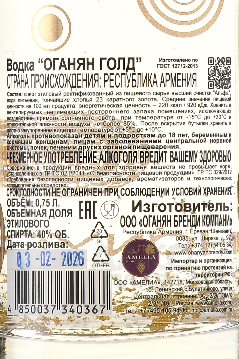 Водка Оганян Голд 0.75 л в тубе