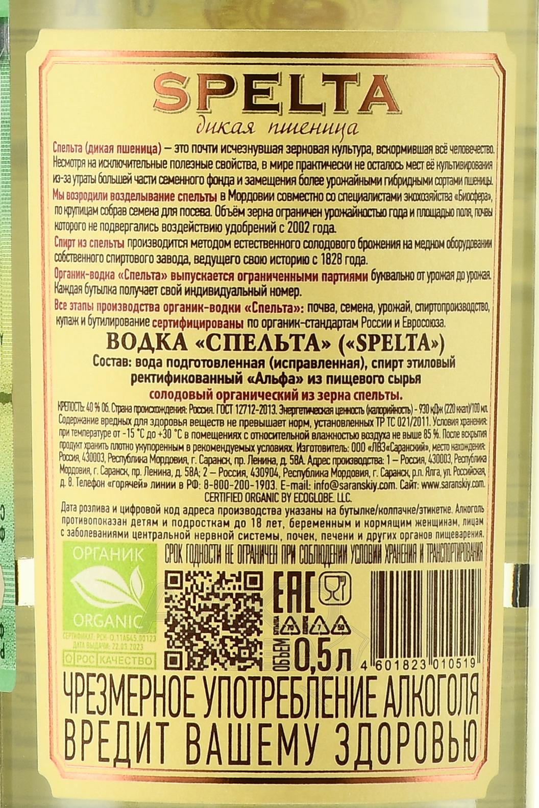 Водка Спельта — уникальный отечественный экологически чистый напиток с классической сорокаградусной крепостью, производимый Саранским ЛВЗ из отборных зерен дикой пшеницы (спельты). Такое сырье отличается богатым аминокислотами и микроэлементами составом, поэтому сертифицировано Европейскими стандартами органической продукции, сертификатами США и РФ, о чем свидетельствуют соответствующие эмблемы на этикетке. Спирты для водки были получены по традиционной методике ректификации с добавлением артезианской воды, после чего их подвергли многоуровневой фильтрации.
