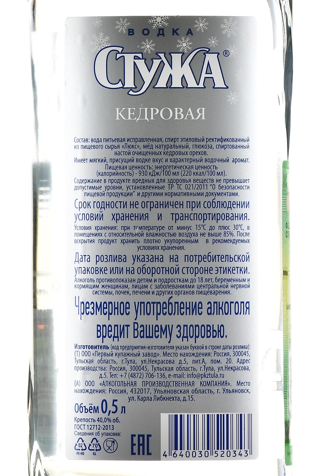 Водка Стужа Кедровая — 40-процентный качественный алкоголь от старейшего российского завода, предлагаемый по доступной цене. Его основой послужили отборные зерновые, обработанные по традиционной методике ректификации с добавлением небольшого количества очищенной воды для формирования нужной крепости. Изюминкой этой разновидности являются душистые ингредиенты — мед и настой кедровых орешков, обогащающие ее полезными веществами и оригинальными вкусовыми тонами.