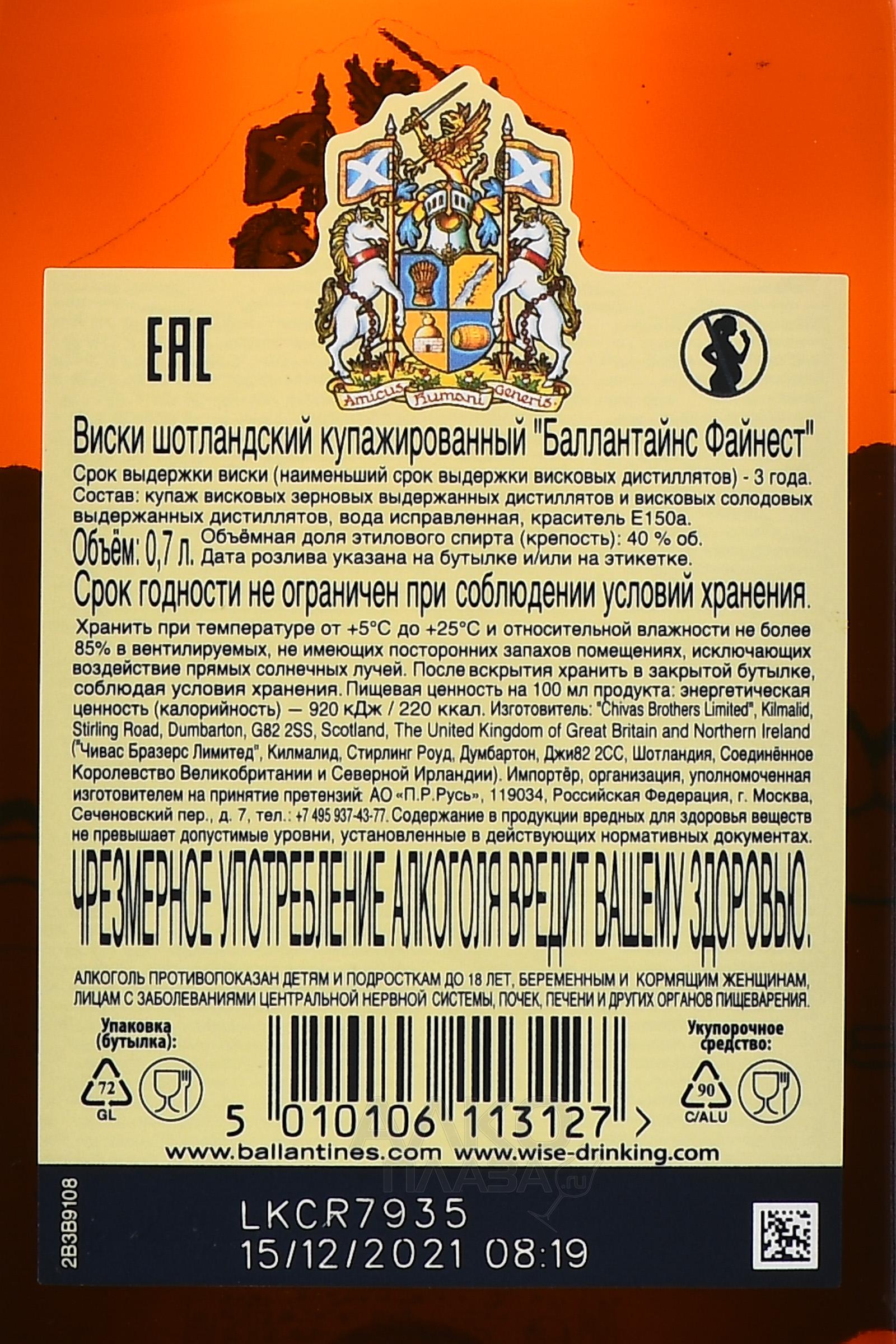 Ballantines Finest 0.7l виски Баллантайнс Файнест - сладкий купажированный виски с мягкой текстурой: спейсайдовские солодовые дают ноты шоколада, ванили и яблока. Занимает второе место в мире по объему среди шотландских виски и первое в Азии по продажам среди брендов премиум.