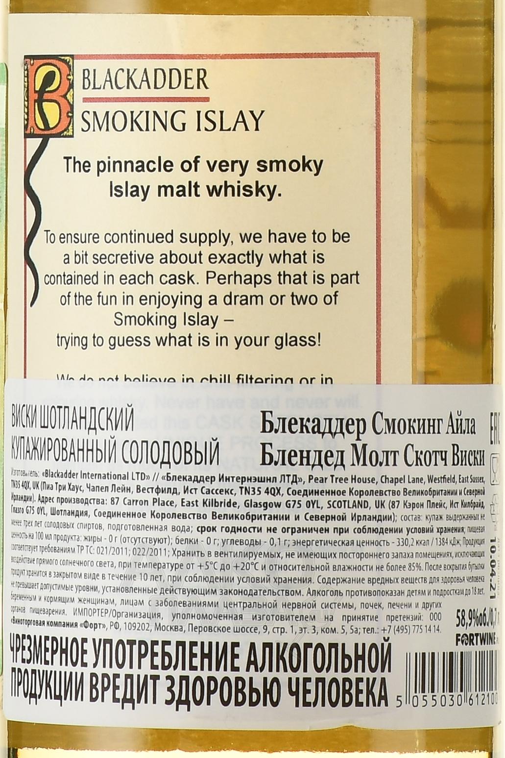 Виски Blackadder Smoking Islay Blended Malt Scotch Whiskey 0.7 л в п/у — купажированный дымно-торфяной шотландский скотч из Спейсайда с уровнем спиртуозности 58,9 градуса. Независимый ботлер Роберт Тучек, будучи писателем и журналистом, одним из первых отказался от холодной фильтрации и искусственных красителей при розливе своего однобочкового виски, выдержанного в бочках из древесины дуба.