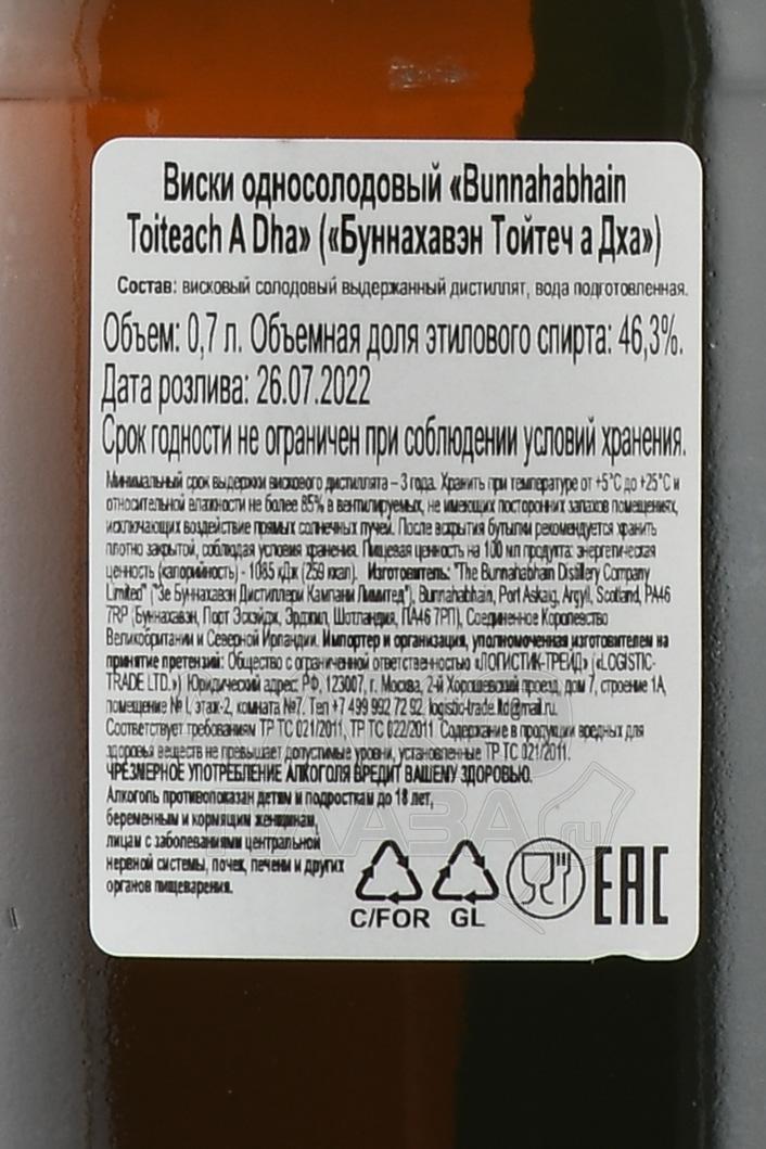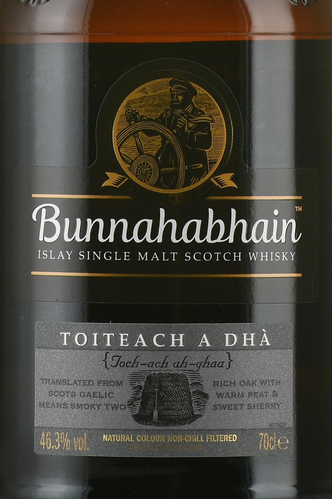 Bunnahabhain Toiteach A Dha - название данного виски переводится как «Smoky Two» с гэльского языка. Это первый дымный релиз от этой дистиллерии. Выдержка смежная, как в бурбонных бочках, так и в хересных. Аромат напитка насыщен фруктами, древесными нотами и легким дымом. Вкус легкий, с оттенками торфа и ванили. Достойный вариант для ознакомления с фенольным (дымным) виски со знаменитого острова Айла.