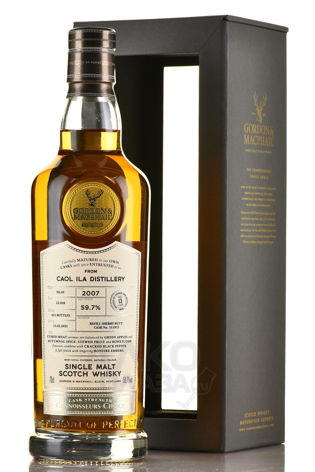 Виски Caol Ila Cask Strength Connoisseur`s Choice 2007 г. 0,7 л в п/у – лимитированный односолодовый сорт выдержанного шотландского спиртного. Напиток продается в комплекте с оригинальной открытой коробкой из картона. В таком виде он послужит солидным презентом, недаром серия, в рамках которой выпущено спиртное, называется «Выбор ценителя». В качестве площадки для создания была выбрана старинная винокурня Каол Айла. Изготовленные на ней дистилляты поместили в дубовые бочки, где выдержали на протяжении 13 лет. Виски бутилирован без холодной фильтрации и разбавления при бочковой крепости 59,7%. Винтаж 2007 года вышел тиражом 611 бутылок.
