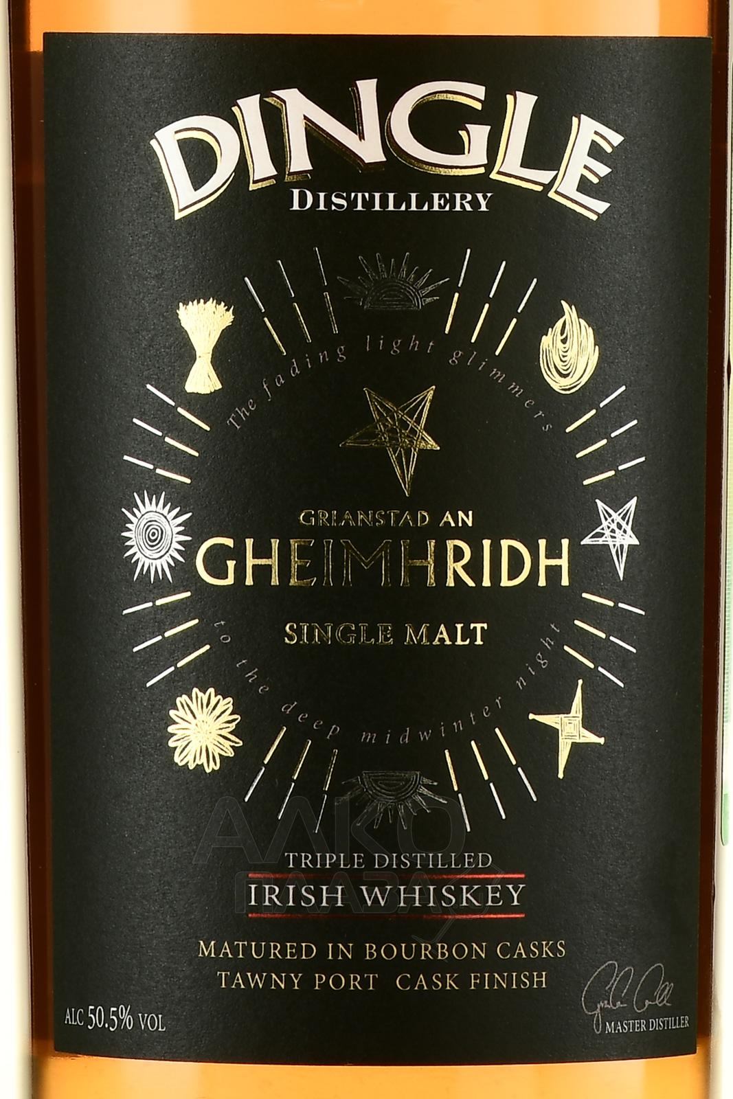 Виски Dingle Grianstad an Gheimhridh Single Malt 7 Years Old 0,7 л — ирландское премиальное спиртное с семилетним сроком выдержки, которое предлагается в средне-высокой ценовой категории. Состав напитка бочковой крепости (50,5%) объединяет спирты на базе солода, прошедшие перегонку на классическом оборудовании и вызревание в барриках повторного наполнения: из-под портвейна и бурбона. Стеклянная бутылка с виски укомплектована черным боксом с логотипом выпустившей дистиллерии.