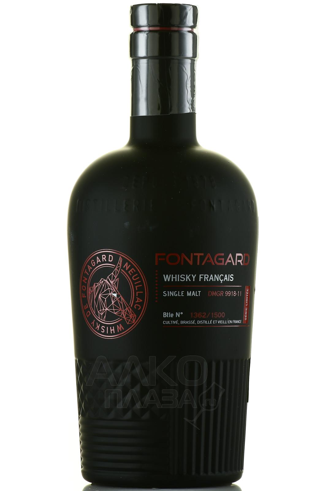 Виски солодовый Fontagard DMGR 9918-11 0,7 л в п/у — необычный французский сингл молт в стильной непрозрачной черной бутылке и гифт-боксе. Подобный алкоголь отлично подойдет в качестве подарка для ценителя и коллекционера. Виски был выпущен ограниченным тиражом — всего 1500 бутылок (каждая пронумерована). Этот купаж был придуман и смешан Домиником Граншером. Его производит компания из провинции Коньяк, применяя традиционные французские технологии дистилляции и выдержки. В роли сырья выступил французский шестирядный ячмень (урожай 2017 года). Дистилляция протекала в шарантских аламбиках объемом 1200-2500 л (2018 год). Виски выдерживался не менее 3 лет в бочках из-под коньяка и красного вина Бордо. Он получил медали на конкурсах World Whiskies Award и Concours Général Agricole.