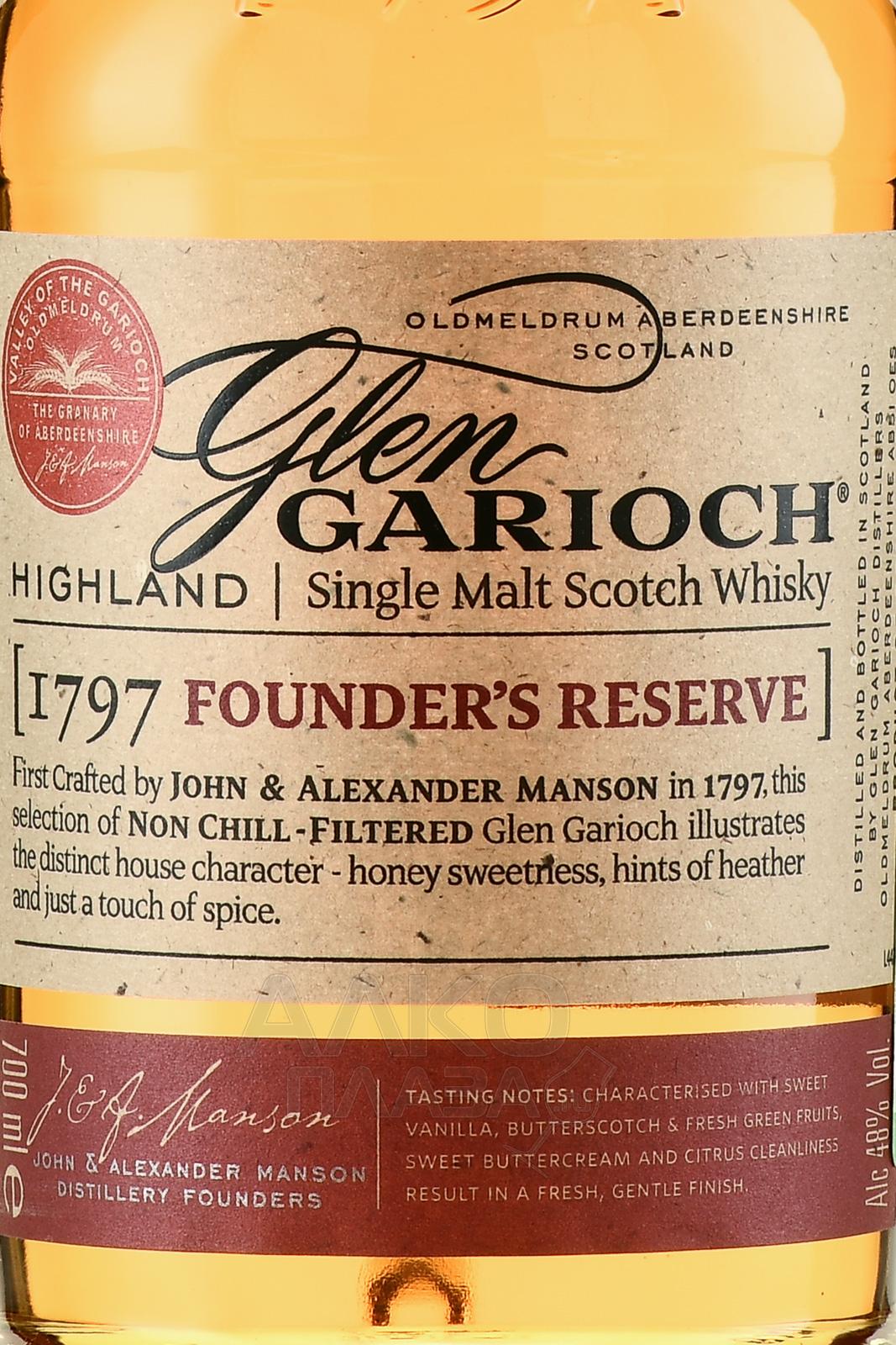Виски Glen Garioch 1797 Founders Reserve 0,7 л — односолодовый скотч Хайленда (этот знаменитый регион находится в материковой части Шотландии), который обладает 48-градусной спиртуозностью и предлагается в рамках средней ценовой категории. В нем присутствуют ячменные дистилляты, произведенные на мощностях одного завода, которые дистиллировали традиционным способом и не подвергали холодной фильтрации. В бочках, выбранных для выдержки скотча, ранее вызревал бурбон, поэтому в букете присутствуют заметные ноты этого алкогольного напитка. Виски продается в гфит-боксе с лаконичным, узнаваемым оформлением визуала.