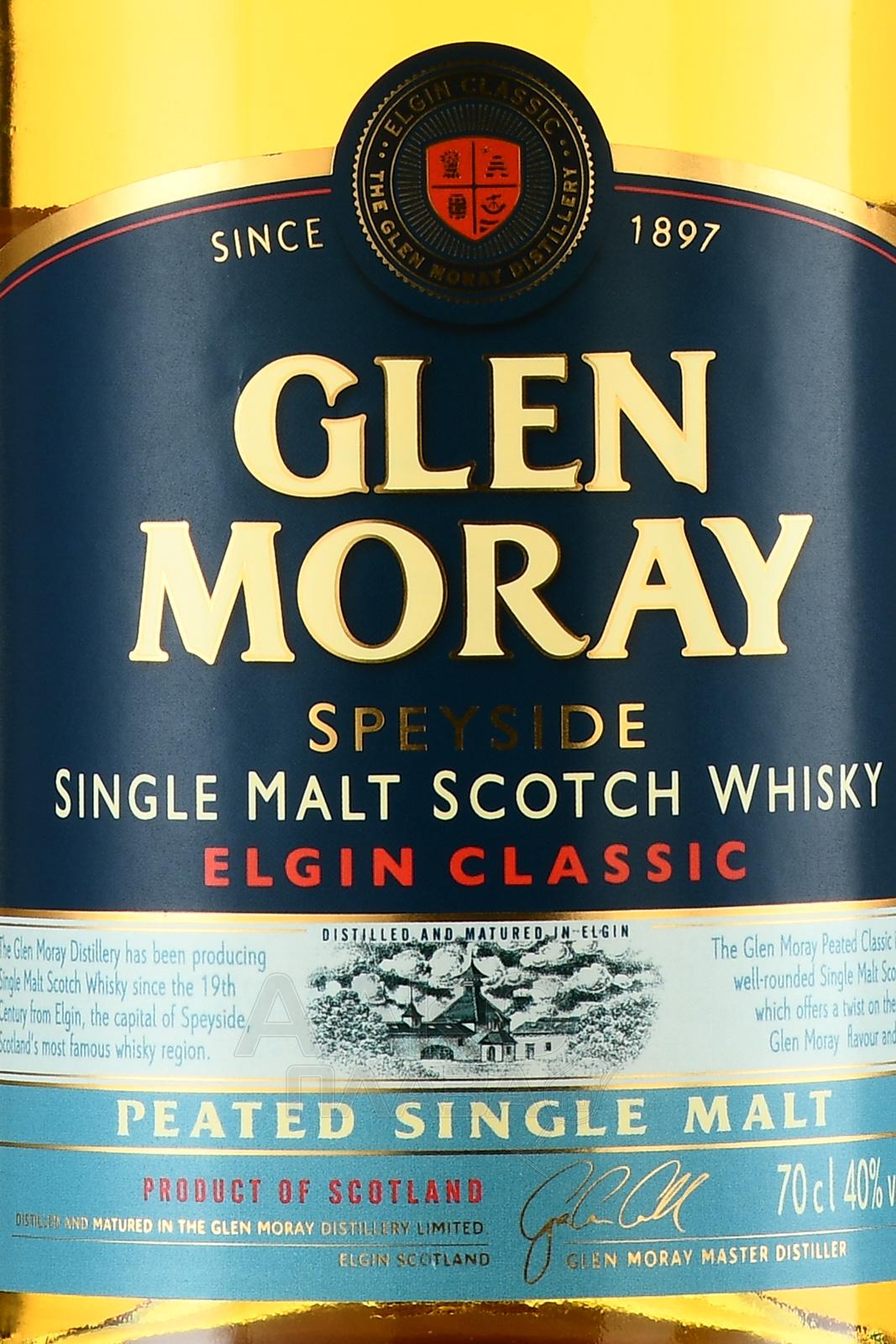 Виски односолодовый Glen Moray Single Malt Elgin Сlassic Peated 0,7 л — базовая версия торфяного скотча, с которой стоит начать знакомство с данной категорией. Это прекрасный подарок для новичка. Виски был произведен в Спейсайде по классической технологии и выдержан в бочках из-под бурбона. Минимальный возраст солодовых спиртов — 3 года.