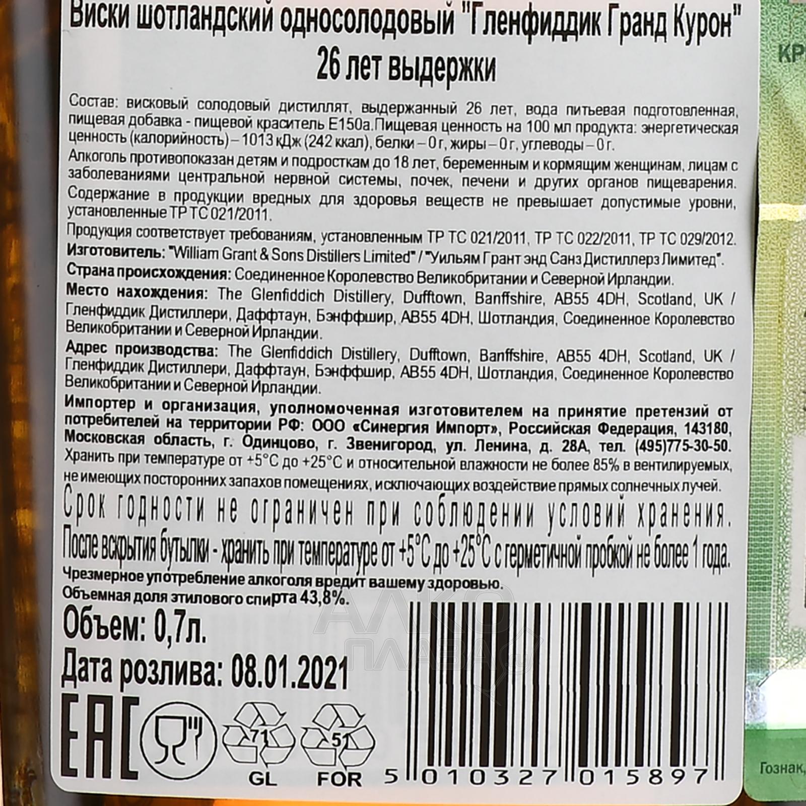 Виски односолодовый Glenfiddich Grande Couronne 26 лет 0,7 л в п/у — подарок для очень особенного случая. Этот суперпремиальный сингл молт представляет собой вершину мастерства, квинтэссенцию всего лучшего, что когда либо создавала вискикурня Гленфиддик из Спейсайда. Недаром этот специальный релиз получил название Гранд Курон, которое с французского переводится как «Великая корона». Это настоящий король скотчей, который получил больше всего наград в мире, подлинное воплощение роскоши и благородства. Главная особенность виски заключается в двухэтапной выдержке: основное время он провел в бочонках из американского и европейского дуба, а затем еще 2 года дозревал в бочках из-под редкого французского коньяка. Общий срок составил 26 лет.