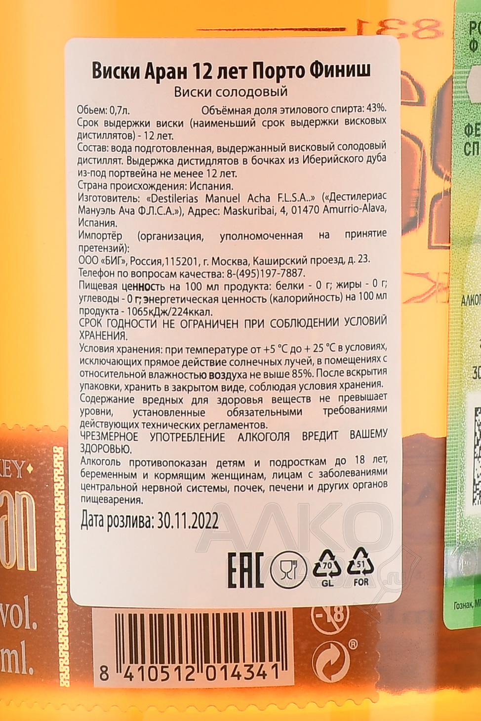 Виски солодовый Haran 12 лет Porto Finish 0,7 л – сорт спиртного от винокурни из Страны Басков. Напиток создан из соложеного зерна. Полученные из сырья спирты провели долгое время в бочках из иберийского дуба, а финишную отделку прошли в емкостях из-под портвейна. В контакте с древесиной, пропитанной парами крепленого вина, дистилляты приобрели интересный и насыщенный профиль.