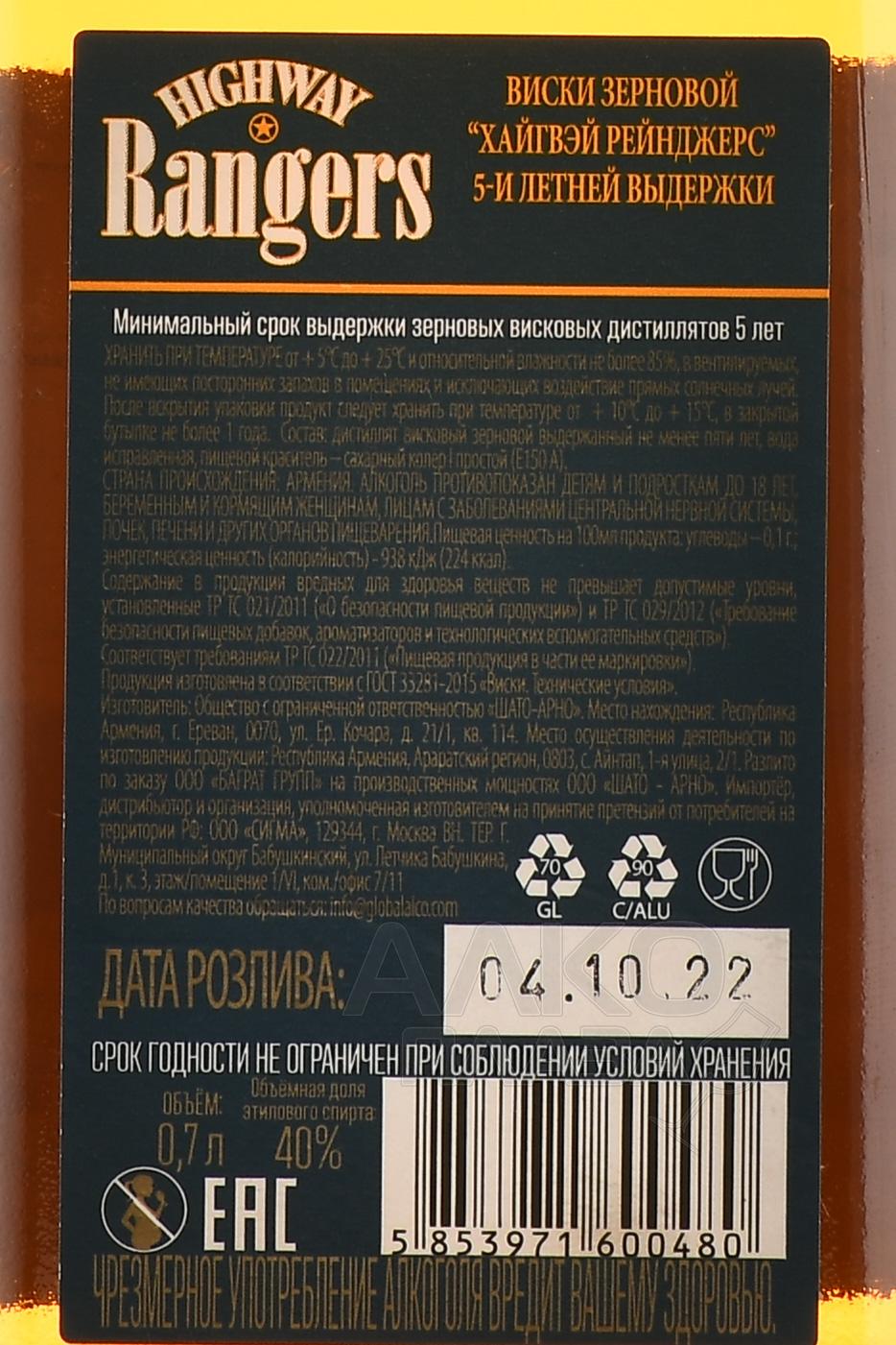 Виски зерновой Highway Rangers 5 лет 0,7 л выпускается армянским производителем, который строго следует ГОСТам и международным стандартам. Качество на каждом этапе изготовления напитка контролируется целой командой опытных специалистов. Висковые дистилляты получают путем двойной перегонки сусла из несоложеного ячменя, ржи и пшеницы. Для этого используются современные колонны непрерывного цикла. Выдержка в течение минимум 5 лет протекает в бочонках из черного карабахского дуба. Виски на выходе имеет крепость 40% и бутилируется после холодной фильтрации.