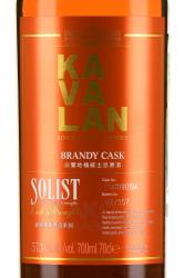 Виски Kavalan Solist Brandy Single Cask Strength 0,7 л в п/у — очень интересный сингл молт с острова Тайвань, имеющий бочковую крепость 57,1%. Он производится небольшими партиями по традиционной технологии — путем двукратной дистилляции в медных кубах. Для выдержки используются французские дубовые бочки из-под бренди. Спирты созревают в дубе не менее 6 лет. Бутилирование осуществляется без холодной фильтрации. Виски представлен в элегантной подарочной коробке и вполне достоин стать праздничным презентом.