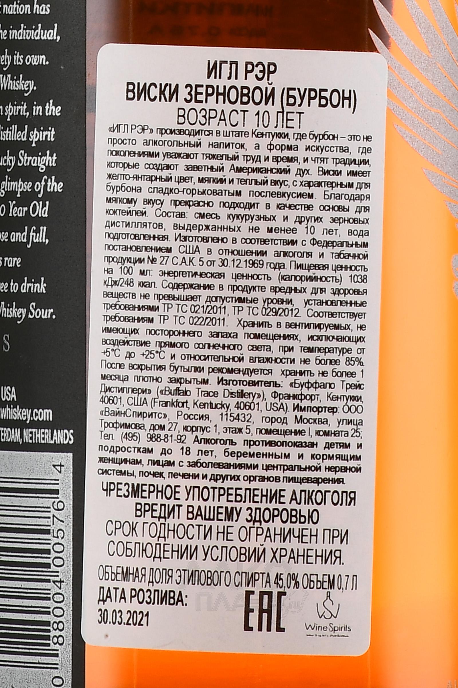 Бурбон Kentucky Straight Bourbon Eagle Rare 10 Years — 45-градусный алкоголь из штата США Кентукки на основе кукурузных спиртов. Для формирования уникальной органолептики их подвергли выдержке в обожженных изнутри дубовых барриках сроком 10 лет. Бурбон относится к категории Straight.