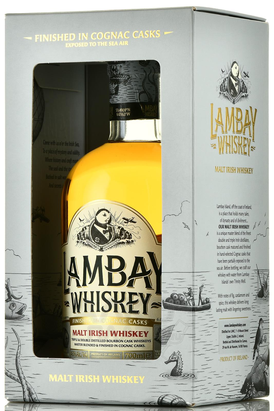 Виски солодовый Lambay Malt Irish Whiskey 0,7 л в п/у — уникальный релиз, заслуживающий внимания ценителей. Он заявлен как «молт в ирландском стиле», и по сути представляет собой купаж солодовых спиртов с 3 разных вискурен (одна из них West Cork, две другие — в секрете). Дистилляты были получены как путем традиционной тройной перегонки (по-ирландски), так и путем двойной перегонки (по-шотландски), затем выдержаны не менее 3 лет в бурбонных бочках. Далее их переправили на остров Ламбей, где происходил финиш в бочках из-под коньяка. Перед бутилированием виски разбавляли водой из местного источника Trinity Well.