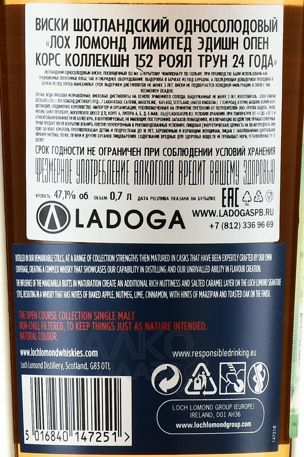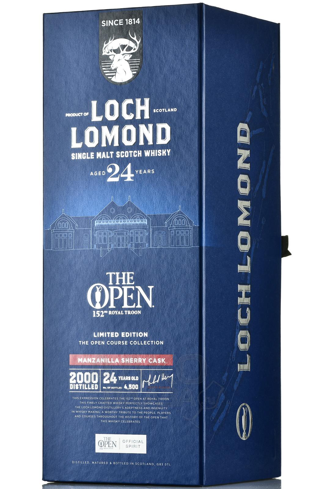 Виски односолодовый Loch Lomond Limited Edition Open Course Collection 152 Royal Troon Loch Lomond 24 года 0,7 л в п/у — редкий коллекционный спецрелиз 2024 года, выпущенный в количестве всего 4500 бутылок и посвященный 152 Открытому Чемпионату по гольфу. Он проходил с 18 по 24 июня в гольф-клубе Роял Трун (город Трун, Южный Эйршир, Шотландия). Дистилляция проводилась в 2000 году с помощью кубов Straight Neck («прямая шея») и Traditional Swan Neck («лебединая шея»). Спирты, выдерживавшиеся не менее 24 лет в американских бочках из-под бурбона, были отобраны мастером купажа Майклом Генри. Составленный им бленд проходил 6-месячную довыдержку в бочонках из-под хереса Мансанилья из города Санлукар-де-Баррамеда. Виски крепостью 47,1% не фильтровали и не окрашивали карамелью.