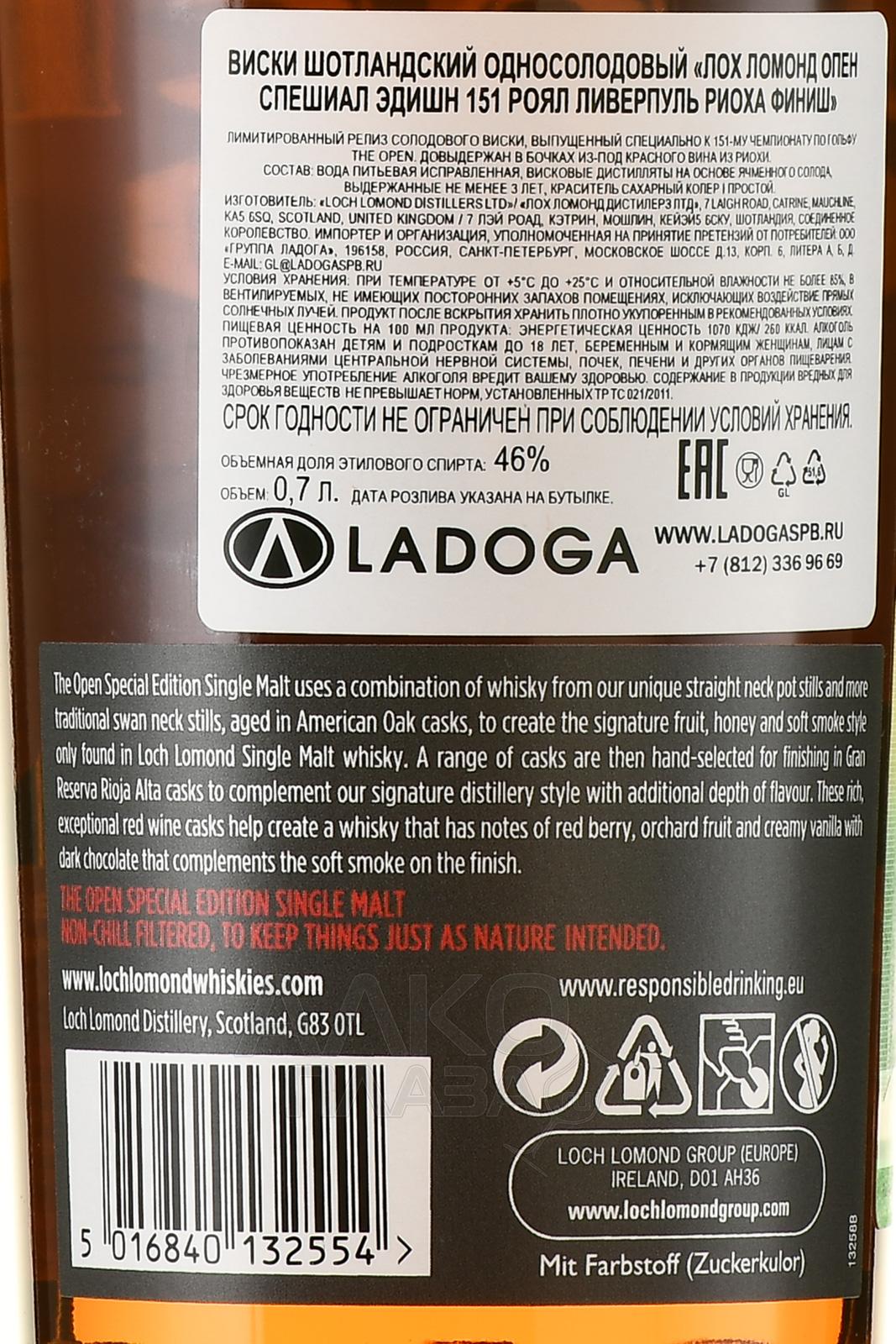 Виски односолодовый Loch Lomond The Open Special Edition 151st Royal Liverpool Rioja Finish 0,7 л в п/у идеально подойдет для любого торжественного события. Лимитированный сингл молт был представлен в 2023 году как совместная работа мастера-купажиста вискикурни Лох Ломонд Майкла Генри и профессионального игрока в гольф Колина Монтгомери (его подпись есть на этикетке). Релиз приурочен к 151 Чемпионату по гольфу серии The Open, который был организован на площадке Роял Ливерпуль. Уникальный скотч в подарочной коробке демонстрирует стиль с узнаваемыми чертами вискикурни из Хайленда и самобытными нотами красного вина из испанской Риохи. Все дело в том, что для финишной 10-месячной отделки использовались бочонки из-под премиального сорта Gran Reserva Rioja Alta. Виски не проходил холодную фильтрацию и был разлит с показателем крепости 46%.