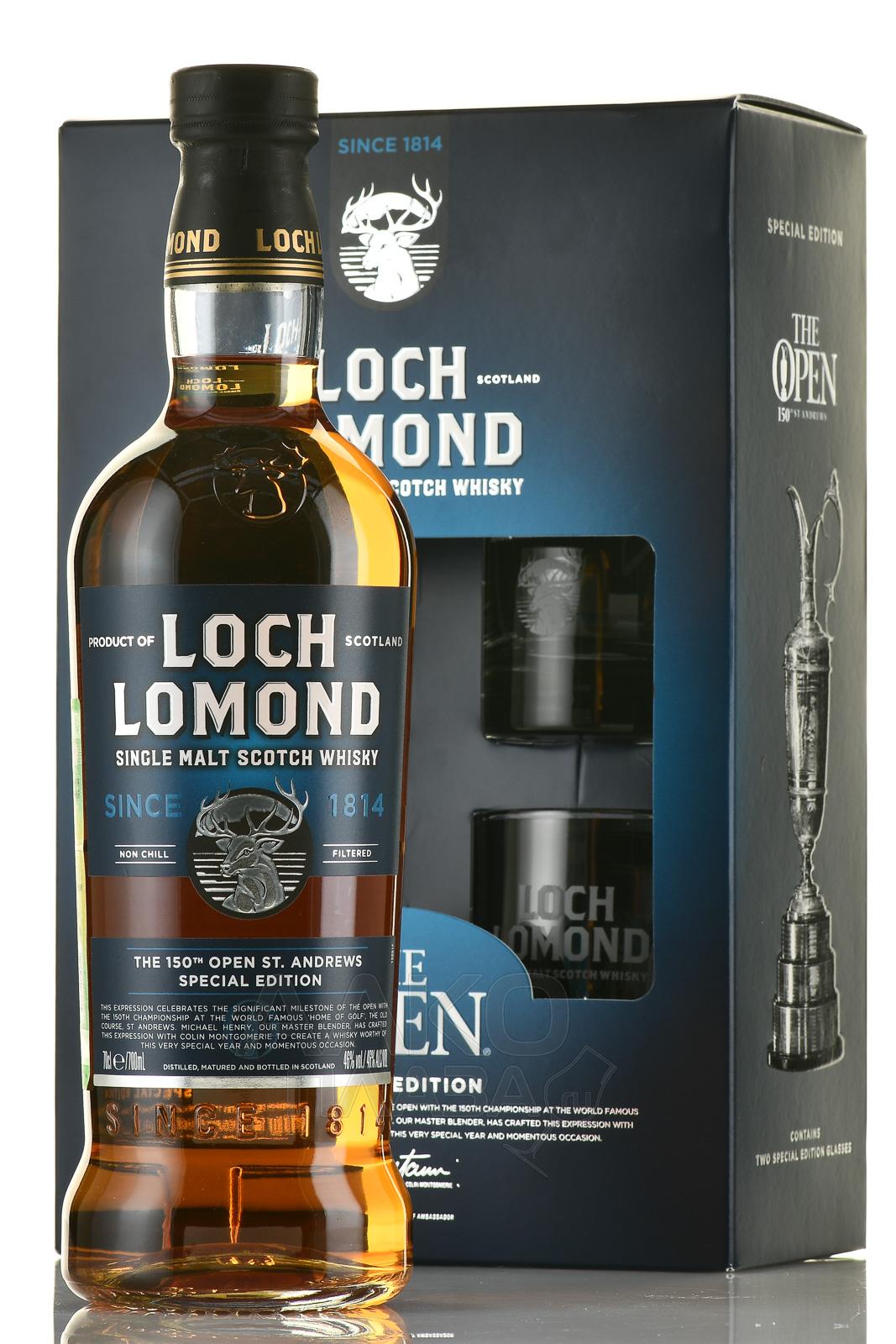 Виски Loch Lomond The Open Special Edition Single Malt 0,7 л реализуется в виде подарочного набора, содержащего бутылку со скотчем и два красивых бокала, украшенных логотипом выпускающей дистиллерии. Напиток односолодового типа крепостью выше среднего уровня (46%) произвели в Шотландском Высокогорье из отборного соложеного ячменя путем двойной перегонки без применения холодной фильтрации. Вызревание в американских дубовых бочонках заняло как минимум три года.