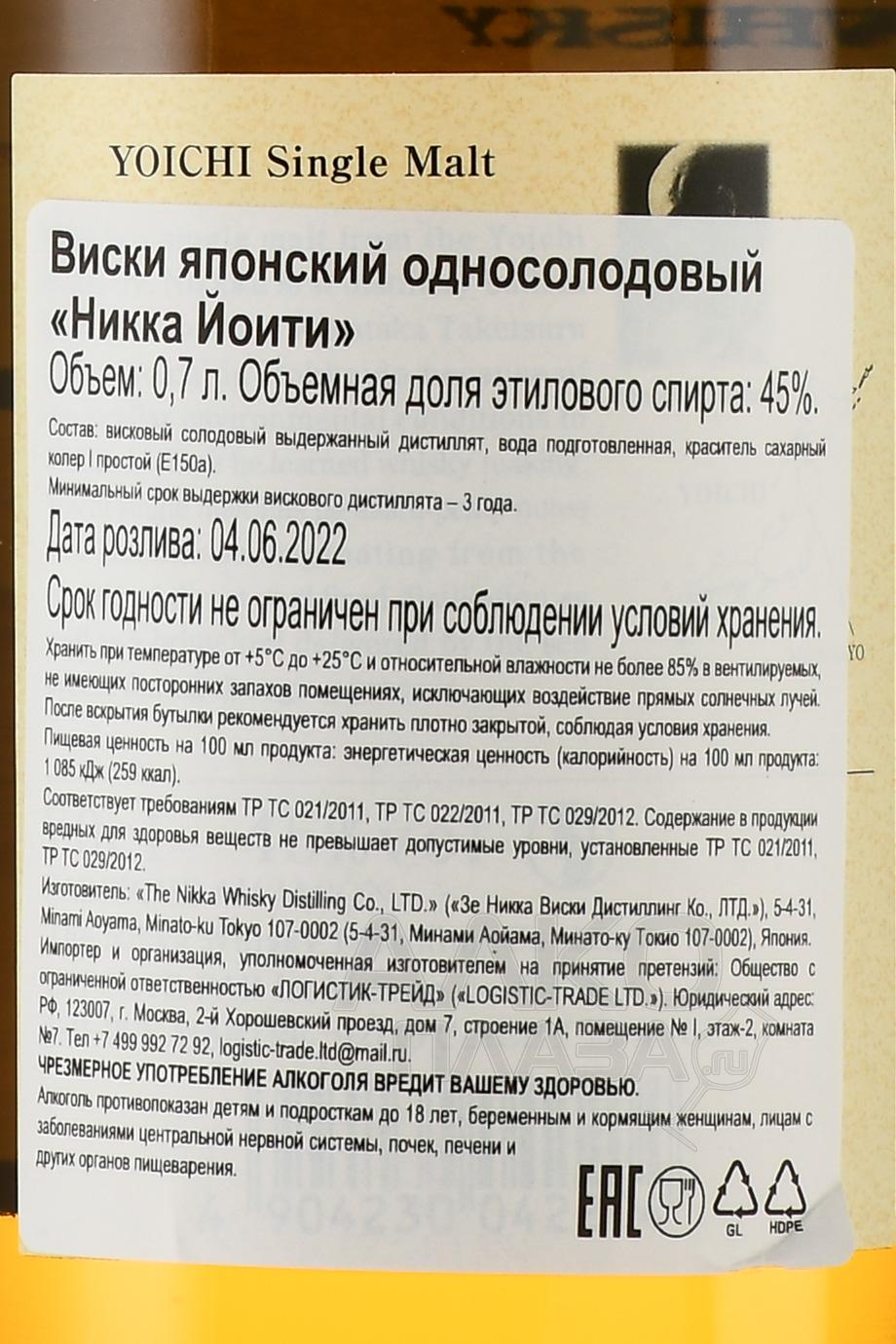 Nikka Single Malt Yoichi ( Никка Йоити Сингл Молт ) - в начале в аромате прослеживается мягкий торф, после раскрываются нотки цукатов и цитрусовых (лимон, апельсин), черной лакрицы и специй (мускатный орех, имбирь). Вкус крепкий и насыщенный, хорошо сбалансированный, с нотками торфа, дыма, специй, свежих фруктов (дыни, киви) и орехов (миндаля, грецкого ореха). Послевкусие богатое и длительное.