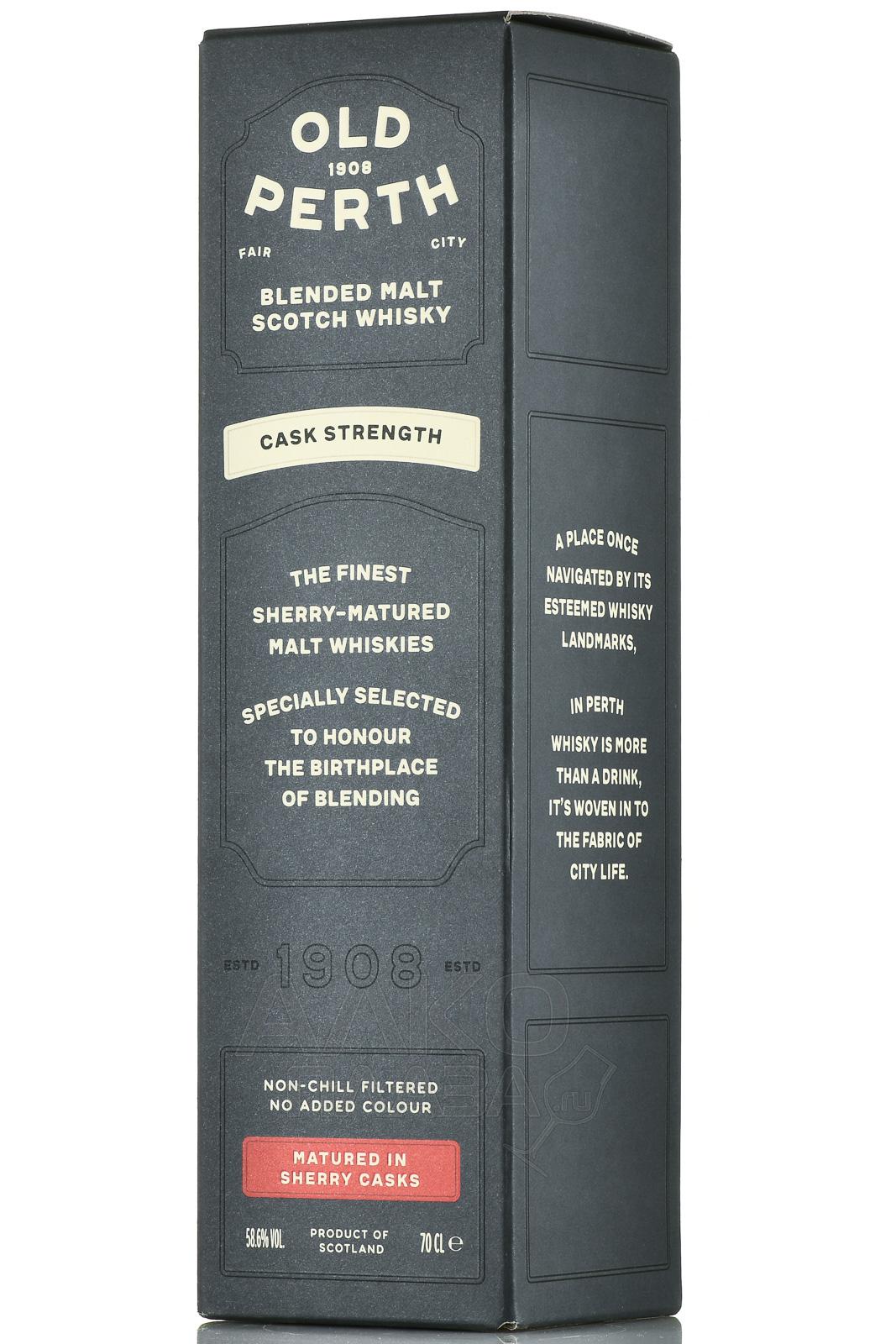 Виски Old Perth Strength 0,7 л относится к формату Blended Malt, ведь в его составе присутствуют ячменные дистилляты с разных заводов. Напиток имеет очень высокую крепость (58,6 процента): этот показатель сформировался благодаря отсутствию в производственном алгоритме процедуры редукции градуса. Алкоголь выдерживался в ценных хересных бочонках, принадлежащих семье Моррисон. Он не подвергался холодной фильтрации.
