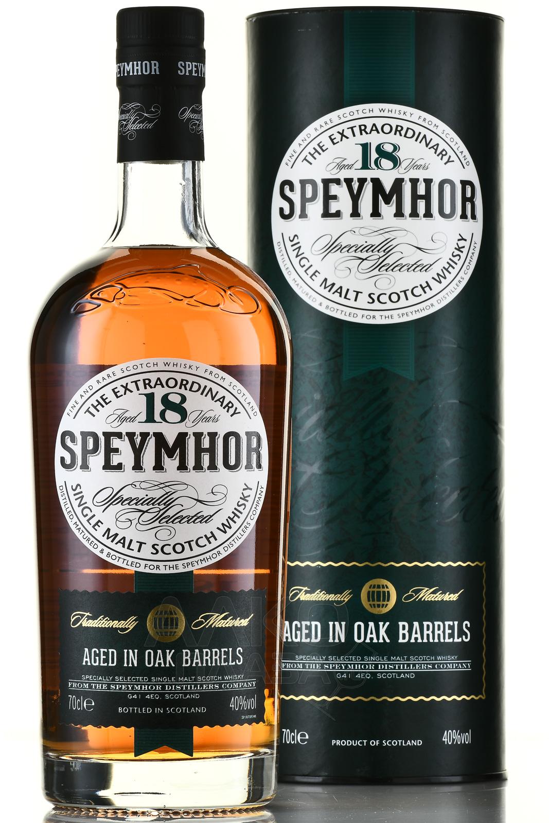 Виски Speymhor Single Malt 18 лет, 0,7 л в тубе — односолодовый скотч из региона Спейсайд. Его выдерживали в течение длительного периода в дубовых бочках-хогсхедах из американского и европейского дуба. Особенность производства — использование чистой воды из горных источников Кэрнгормс. Это придаёт виски выразительный характер и сбалансированность. Уникальность сингл молта заключается в долгой выдержке, благодаря которой вкус становится особенно мягким и насыщенным.