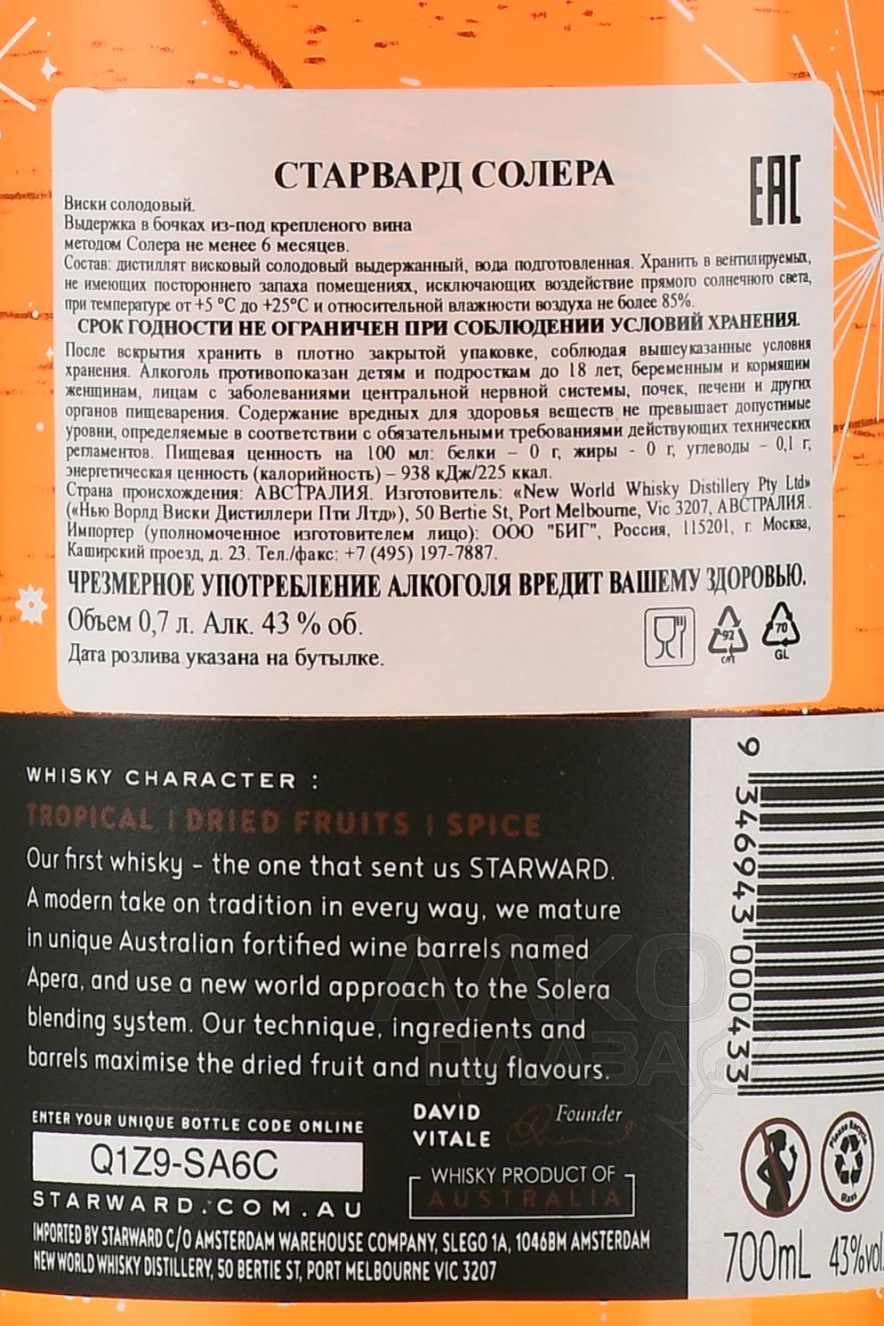 Виски односолодовый Starward Solera 0,7 л в п/у производится в Австралии и обладает уникальным профилем. Его можно выбрать в подарок для ценителя на любой праздник. Премиальный алкоголь получил медали на самых престижных конкурсах, в том числе и двойное золото. Неповторимый характер виски обусловлен выдержкой по системе солера, благодаря чему спирты разных возрастов смешивались постепенно и ассимилировались. Самые молодые дистилляты созревали не менее 6 месяцев. Для выдержки применялись особые бочки из-под крепленого вина Apera (похоже на херес) от винодельни МакВиллиамс.