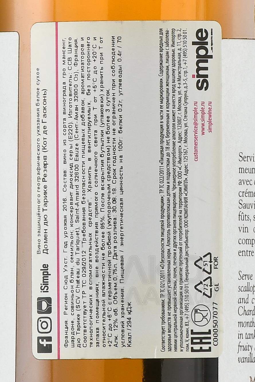 Domaine du Tariquet Reserve - вино Тарике Резерв 0.75 л белое сухое