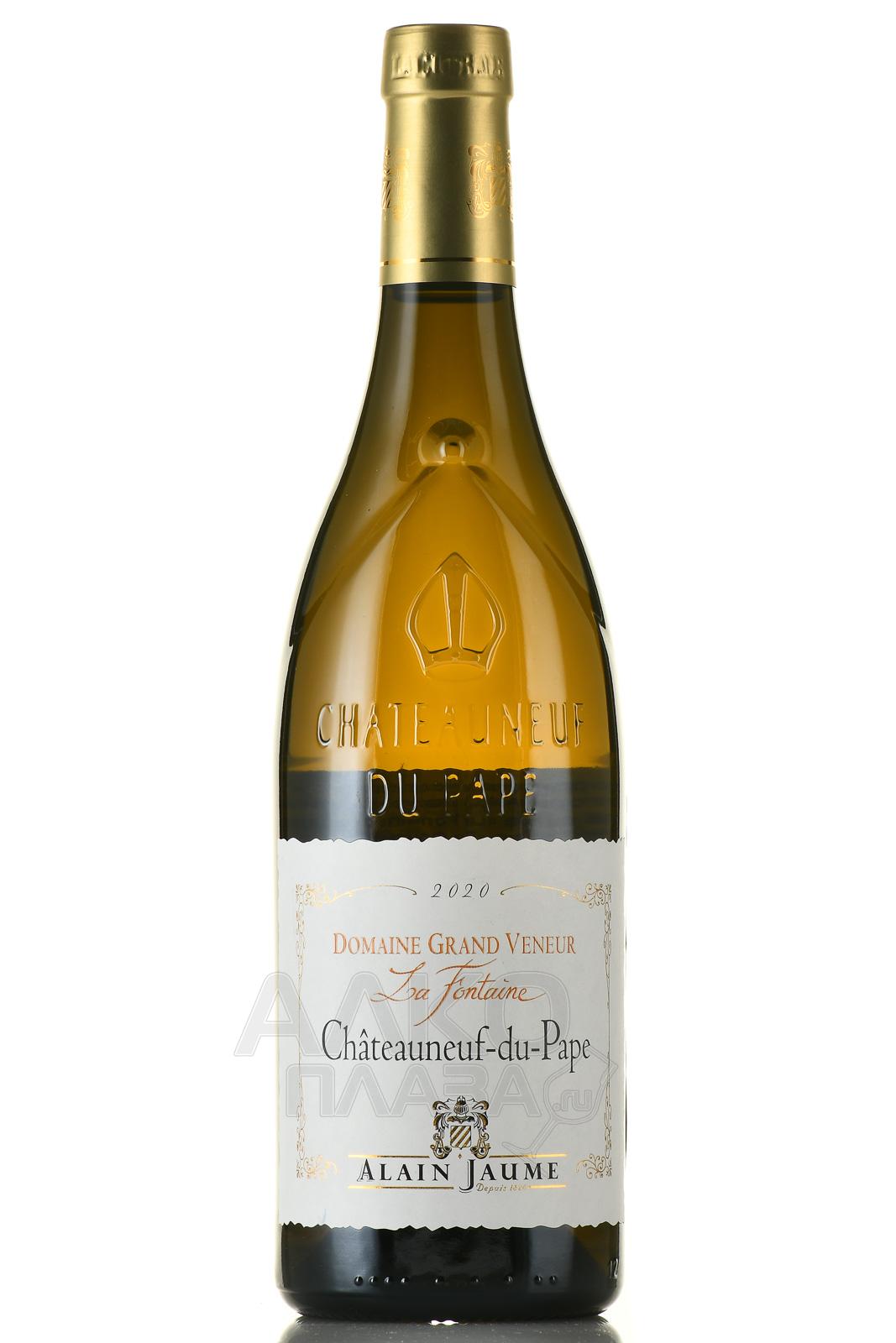 Белое сухое вино Alain Jaume & Fils Domaine Grand Veneur Chateauneuf-du-Pape La Fontaine 2020 г. 0,75 л — моносепажный спиртной напиток, который произвели в местности Шатонеф-дю-Пап (Долина Роны, Франция) из урожая с дренированных песчано-известняковых почв, содержащих вкрапления глины. Сбор, ограниченный утренними часами, провели на участках северной экспозиции, где сложился самобытный терруар, препятствующий возникновению заболеваний виноградной лозы. Ягоды охладили и подвергли гребнеотделению, далее осуществились процессы брожения и 10-месячной выдержки в барриках — новых и возрастом один год.