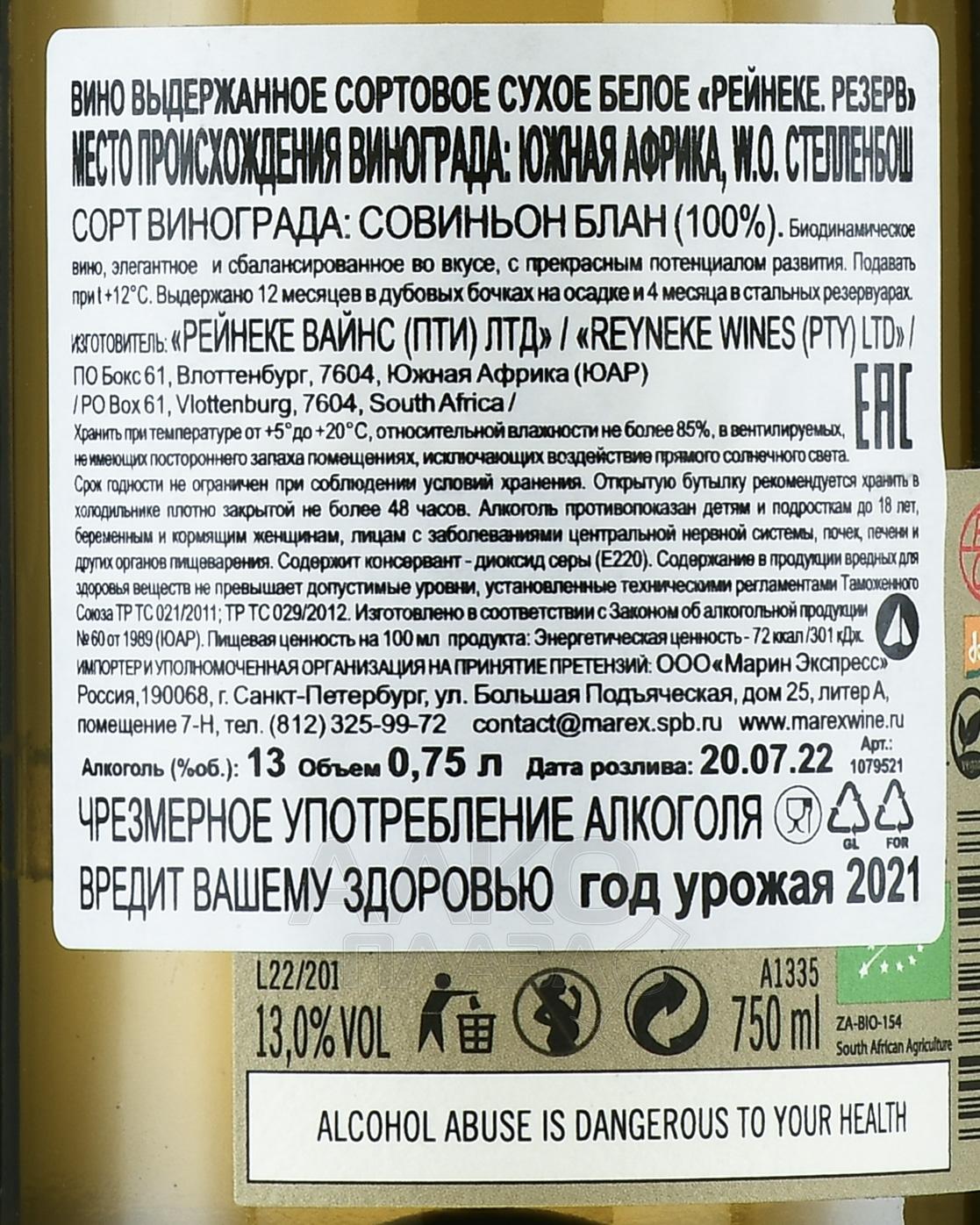 Reyneke Reserve White 0,75 л – премиальное белое сухое вино из ягод Совиньон Блан. Для его изготовления производитель использует виноград, выращенный на тщательно подобранных участках. После ручной сортировки плоды подвергают прессованию. Далее следует естественная ферментация в 300-литровых бочках из французского дуба, из которых 95% – новые. В течение года напиток выдерживается на осадке в дубовых барриках и еще 4 месяца – в стальных емкостях. Вино может храниться в бутылке в течение 5-6 лет.