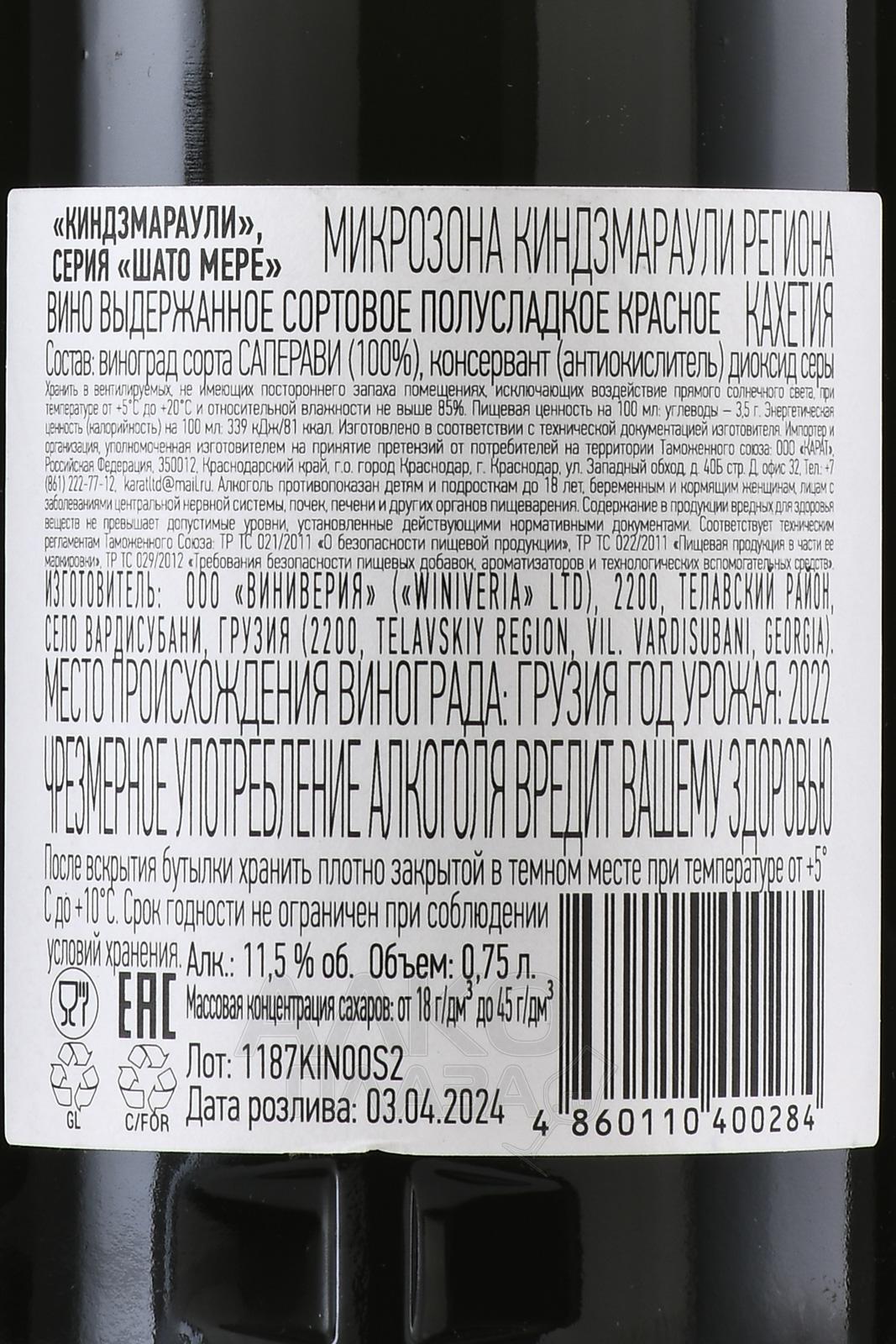 Красное полусладкое вино Chateau Mere Kindzmarauli 0.75 л изготовлено по европейским стандартам из аборигенного сорта винограда одного года сбора. Благодаря почвенно-климатическим условиям, на которых произрастает виноград, вино получается с неповторимым ароматом и вкусом. Напиток разливают в темную стеклянную бутылку с выпуклой гравировкой на стекле и стильной этикеткой, крепостью 12,5%.