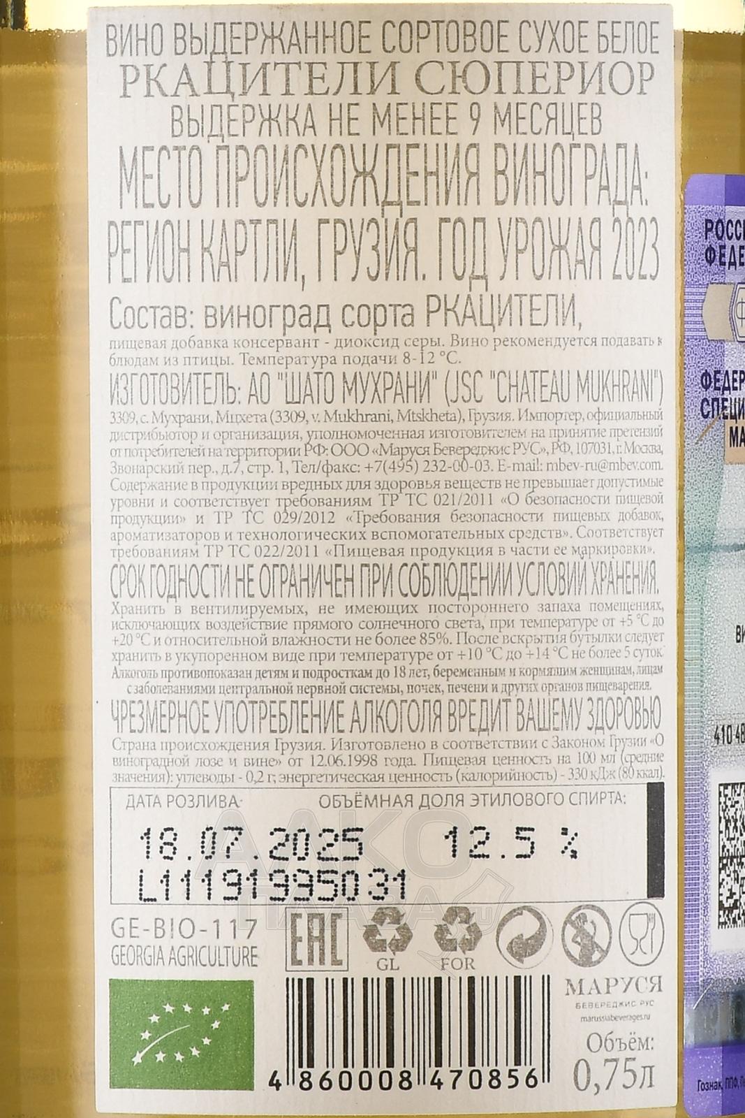 Белое сухое вино Chateau Mukhrani Rkatsiteli 0.75 л создано из аборигенного сорта винограда Ркацители. Сборка урожая проходит в один год вручную и в течение 7-12 минут доставляется на винодельню, таким образом сохраняется свежесть плодов. Ягоды сортируют, дестеблируют при 5-6 градусов, а после отправляют на дробление. Вино выдерживают на дрожжевом осадке, такой метод называется - sur lie. Разливают его в стеклянные бутылки, крепостью 12,5%.