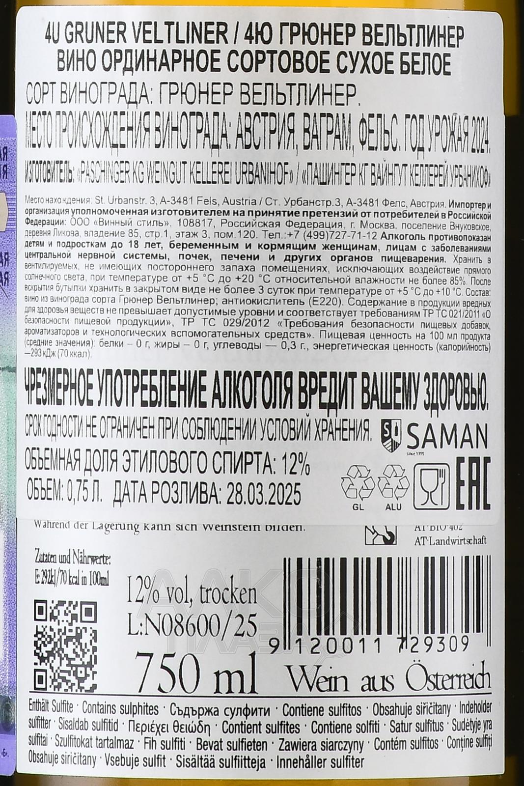 Белое сухое вино Urbanihof 4U Gruner Veltliner 0,75 л – типичное выражение богатого австрийского терруара. Напиток происходит с виноградников региона Ваграм. Чтобы создать спиртное с индивидуальным характером, производитель использовал урожаи одного года сбора. Винификация проходила классическим путем – в стальных чанах с режимом термоконтроля.