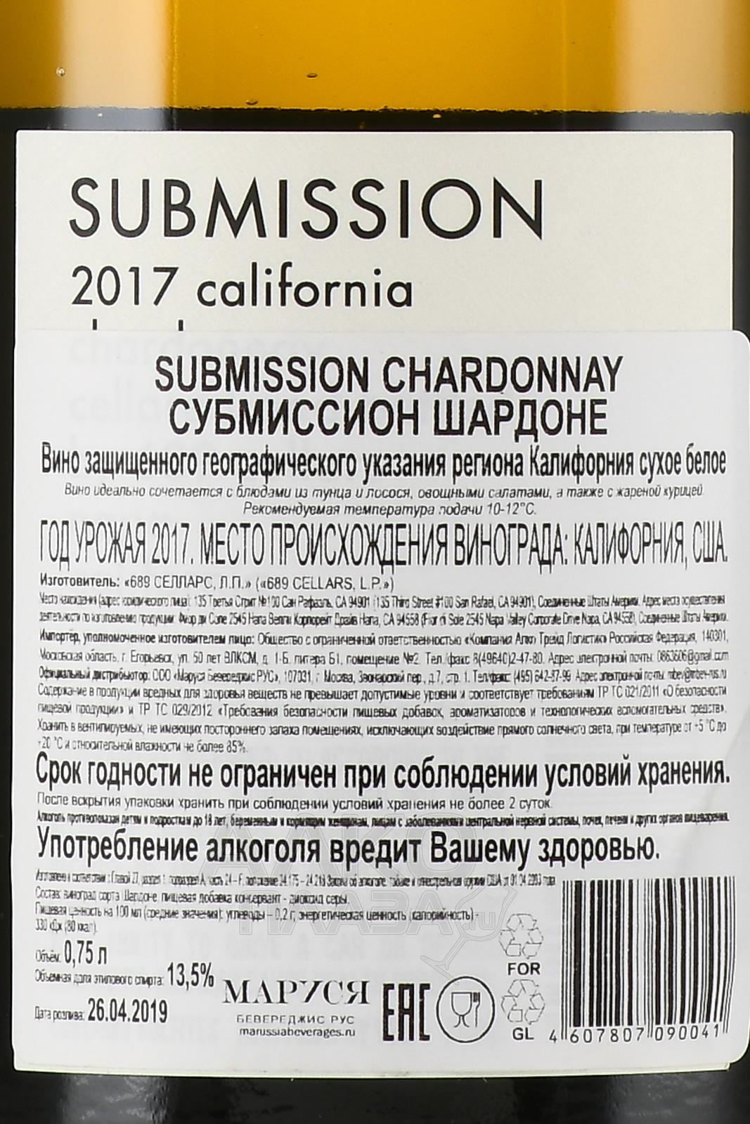 Белое сухое вино 689 Submission Chardonnay 2017 года 0,75 л создано из одного сорта Шардоне по традиционной технологии. Виноград был собран в 3-х калифорнийских субрегионах: Рашн Ривер, Карверос и Монтерей. Сырье из отдельных терруаров обладает уникальными органолептическими показателями, благодаря чему купаж стал многогранным и сложным. Винификация осуществлялась в стальных чанах при контролируемой температуре. Вино выдерживалось несколько месяцев и разливалось после фильтрации и осветления.