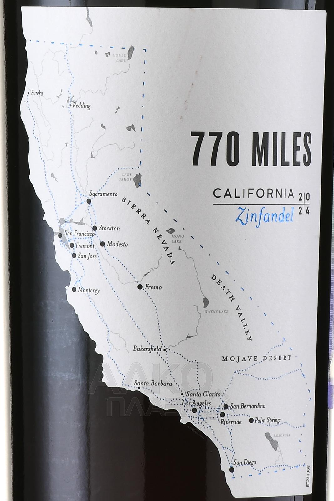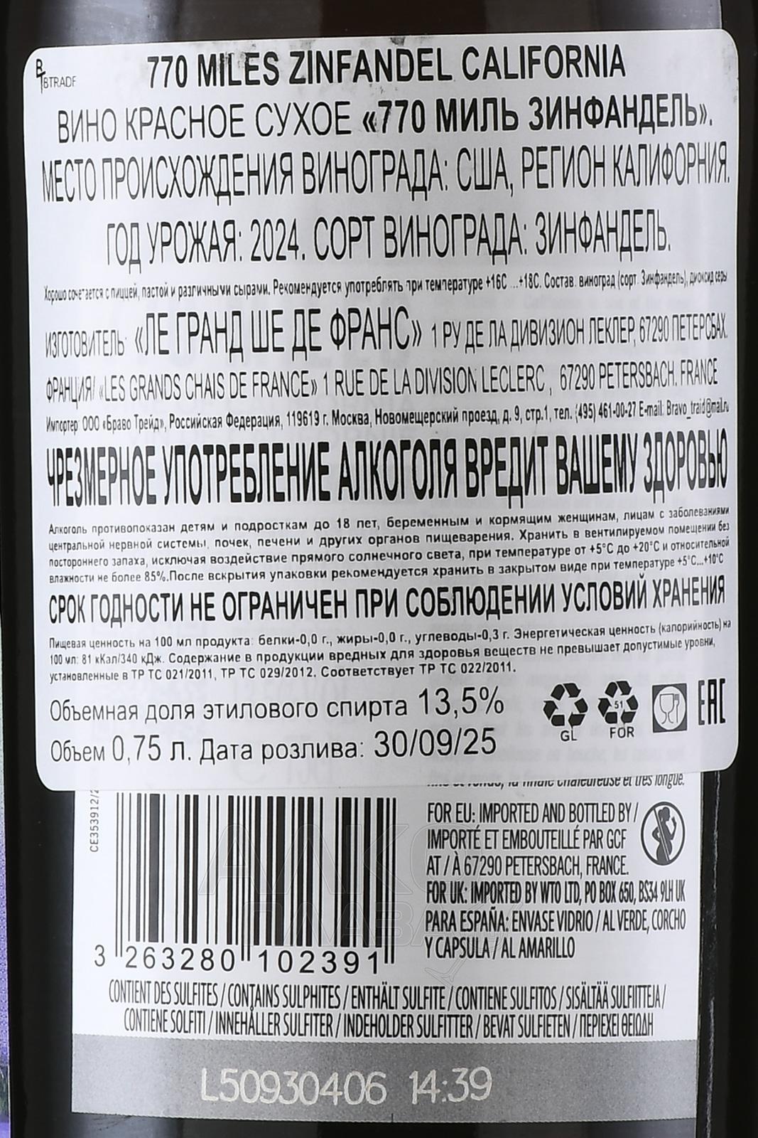 Красное сухое вино 770 Миль Зинфандель 2021 г. 0,75 л – 13-градусный напиток, который изготавливают из одноименного сорта винограда одного года сбора, который завезли в Центральную долину Калифорнии из Хорватии. 770 миль — это то расстояние, которое нужно, чтобы пересечь всю долину с севера на юг, если направиться из одной винодельни производителя в другую. Для компании одним из важных факторов является сохранение исконной рецептуры винификации. Поэтому при изготовлении своих напитков они используют традиционные методы в совокупности с последними инновационными технологиями винной промышленности.