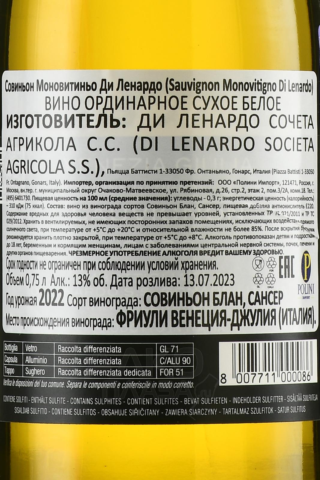 Белое сухое вино Di Lenardo Sauvignon Blanc 0,75 л - напиток, создаваемый из всемирно известного сорта - Совиньон Блан. Урожай для производства собирается исключительно ручным способом на этапе оптимальной спелости, далее ягоды сортируются и бережно отжимаются. Алкогольное брожение протекает в стальных чанах при строгом температурном контроле, перед розливом производилось созревание на тонком осадке на протяжении 3 месяцев с регулярным батонажем.