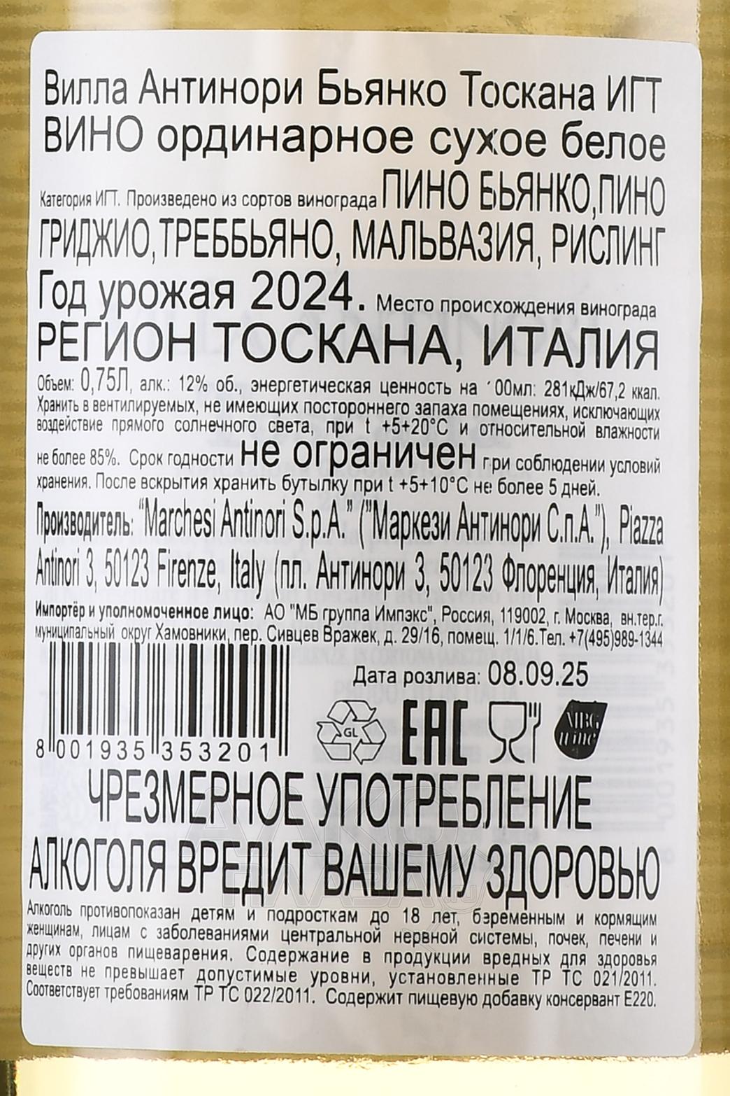 Сухое белое вино Villa Antinori Bianco 0,75 л впервые увидело свет в 1931 году. Для его производства используется светлый виноград нескольких сортов и классическая технология винификации. Плоды очистили от стеблей и подвергли деликатному прессованию. После охлаждения до 10 °С сусло отстаивали двое суток, а затем разлили в стальные резервуары, где оно проходило алкогольную ферментацию при температуре не выше 18 °С. Когда закончилось брожение, вино охладили до 10 °С и оставили отдохнуть в емкостях из нержавеющей стали.