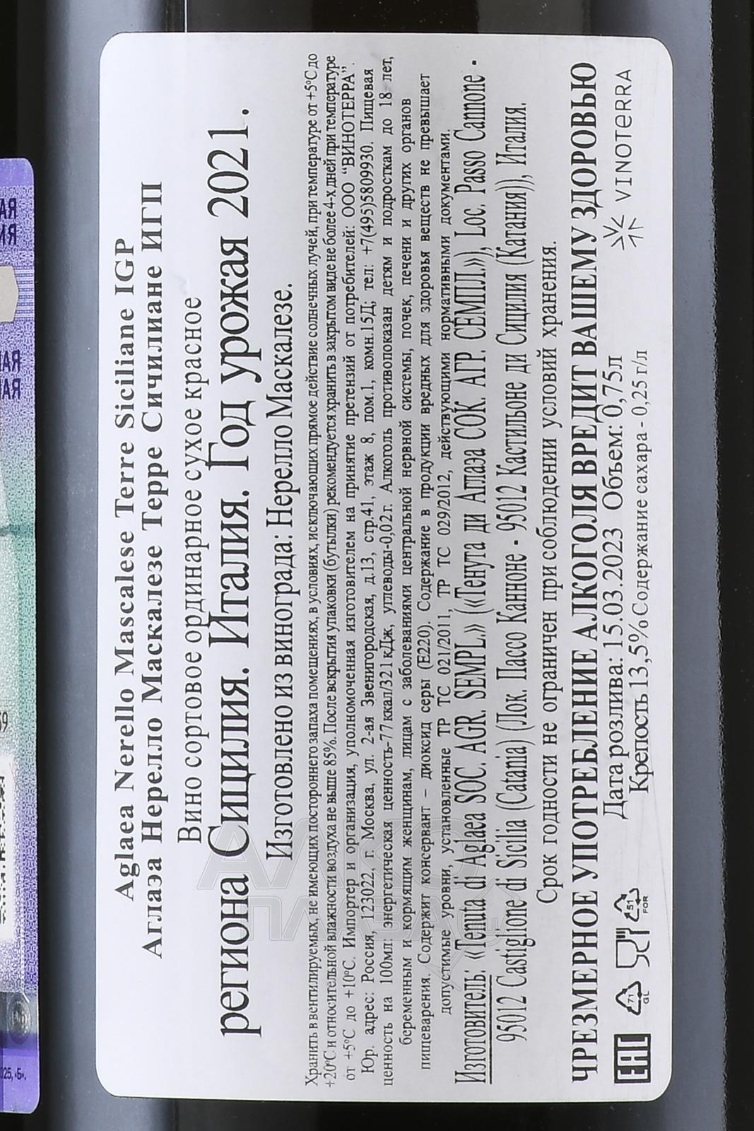 Вино Aglaea Nerello Mascalese Terre Siciliane IGP 0,75 л красное сухое создается из винограда, выращенного на вулканических почвах у подножия действующего вулкана Этны. Участки обращены на север и северо-восток на высоте 750 м. Собранный урожай прессуют и мацерируют при 10 °С на протяжении 2-х дней, и при 28-30 градусах в течение 6 дней. Яблочно-молочное брожение и выдержку проводят в стальных чанах.