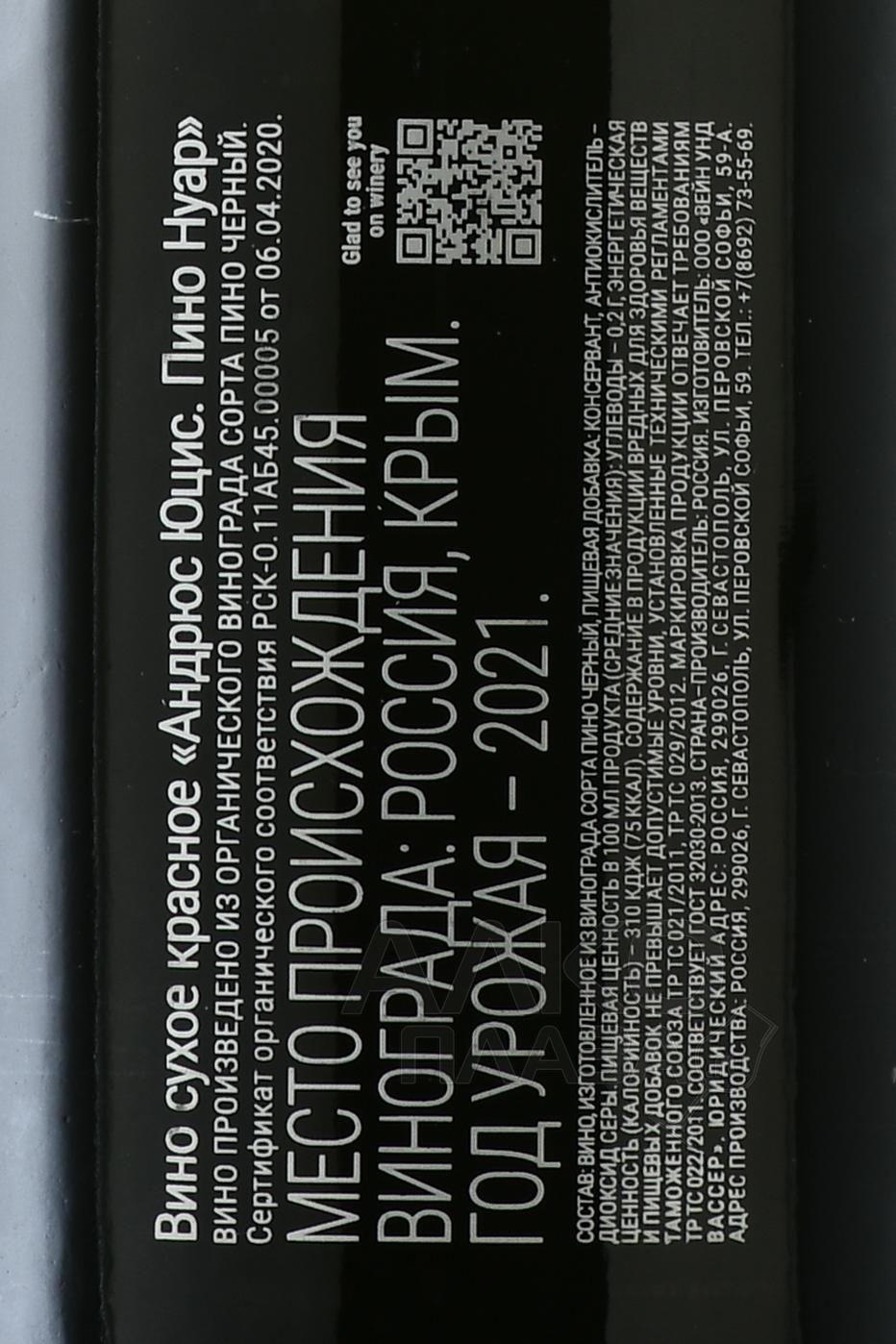 Красное сухое вино Андрюс Юцис Пино Нуар 0,75 л создано из качественного винограда европейской вариации, выращенного на склонах горы Каратау в Крыму. Собранные в течение одного сезона спелые ягоды подверглись классической терморегулируемой винификации в стальной таре. 12-месячное вызревание протекало в металлических чанах.