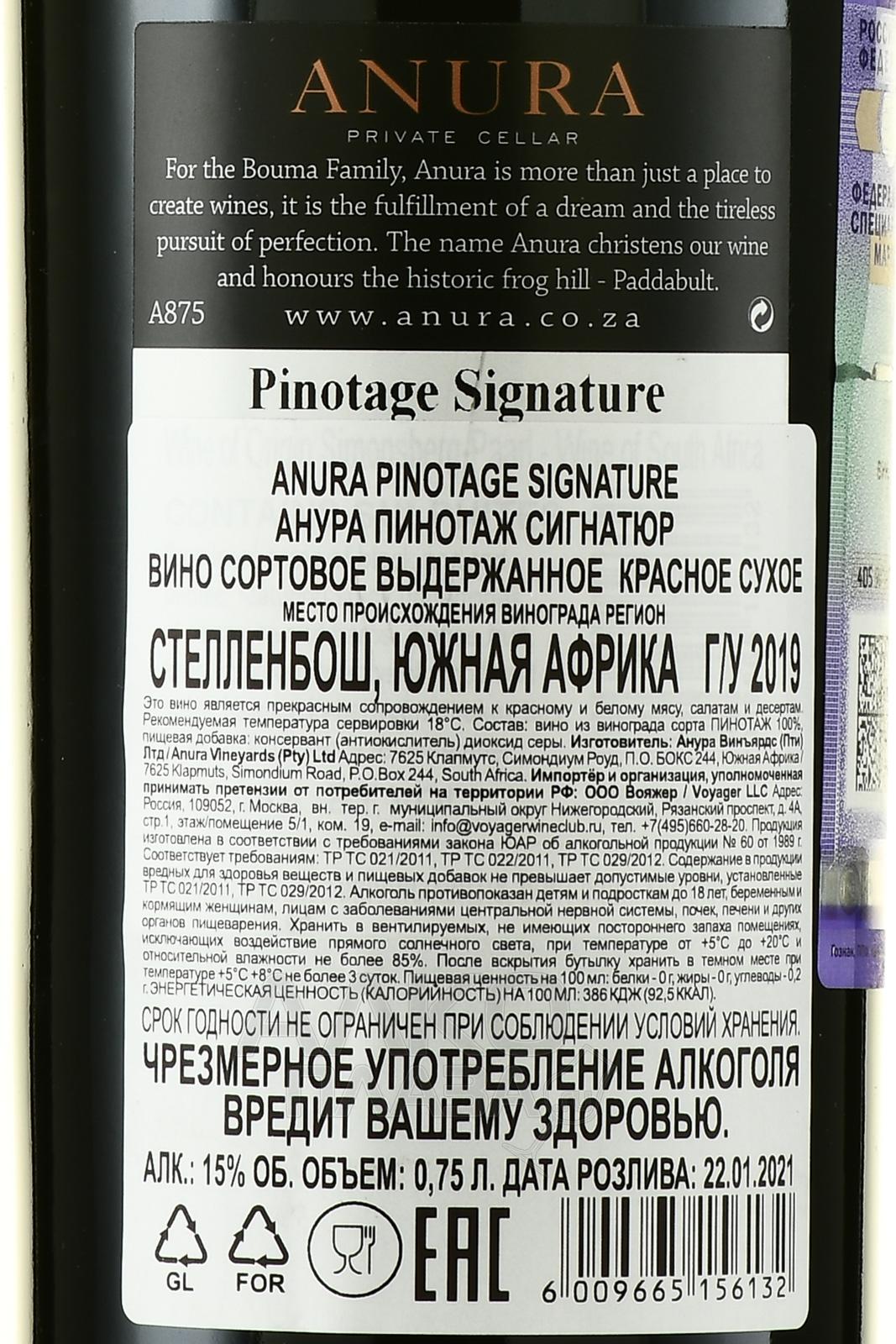 Красное сухое вино Anura Pinotage Signature 2019 года 0,75 л — современное, яркое, с хорошо выраженными терруарными чертами. Южно-африканский сорт Пинотаж для его производства выращен в предгорьях Симонсберга в регионе Паарл. Лозы были высажены на северо-западном склоне в 90-е годы прошлого века. Собранное сырье мацерировали двое суток, затем сусло ферментировали в стали с малолактикой. Вино проходило выдержку во французских (60%) и американских (40%) дубовых бочках на протяжении 16 месяцев.