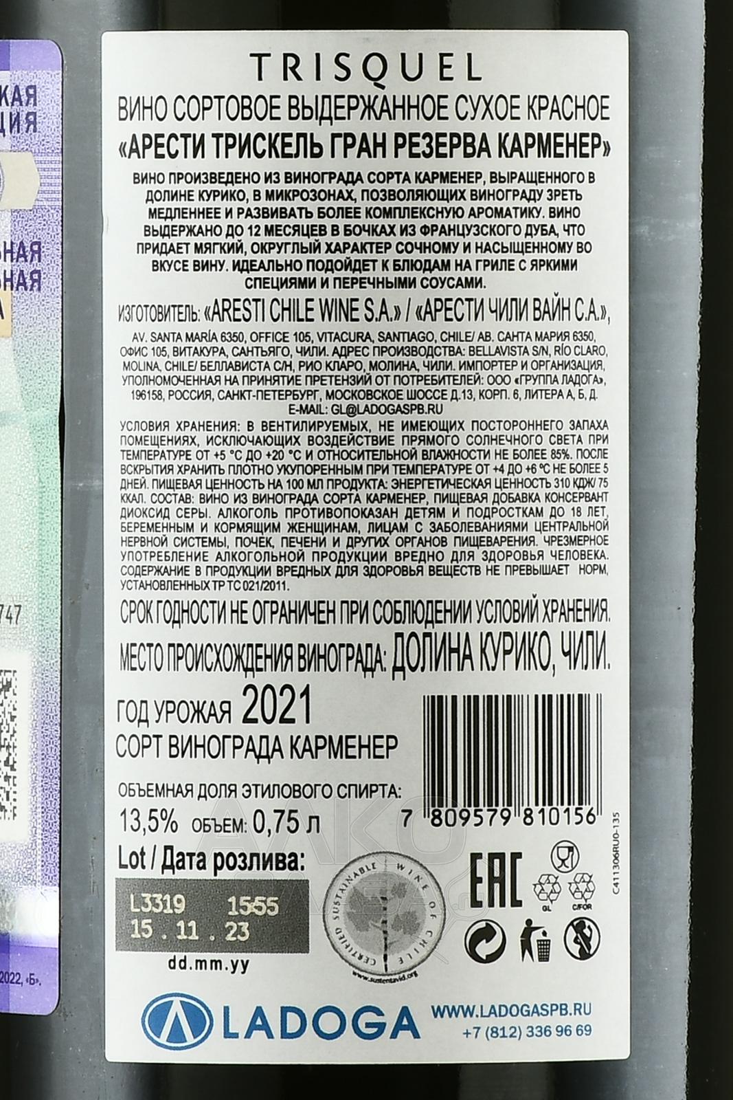 Красное сухое вино Aresti Trisquel Gran Reserva Carmenere 2021 года 0,75 л отражает в своем характере идеальный баланс насыщенности, элегантности и сложности. Название отсылает к 3 основополагающим элементам — вода, земля, климат, которые находятся в строгом равновесии. Каждый из них имеет важное значение для успешного виноделия. Великолепный чилийский Карменер рожден в самом сердце долины Курико — одном из лучших терруаров страны. Лозы были высажены у подножия гор в 80-х годах прошлого века. Виноград собирали с конца апреля по начало мая ручным способом. Ферментация протекала в стали, выдержка (около года) — в бочках из французского дуба.