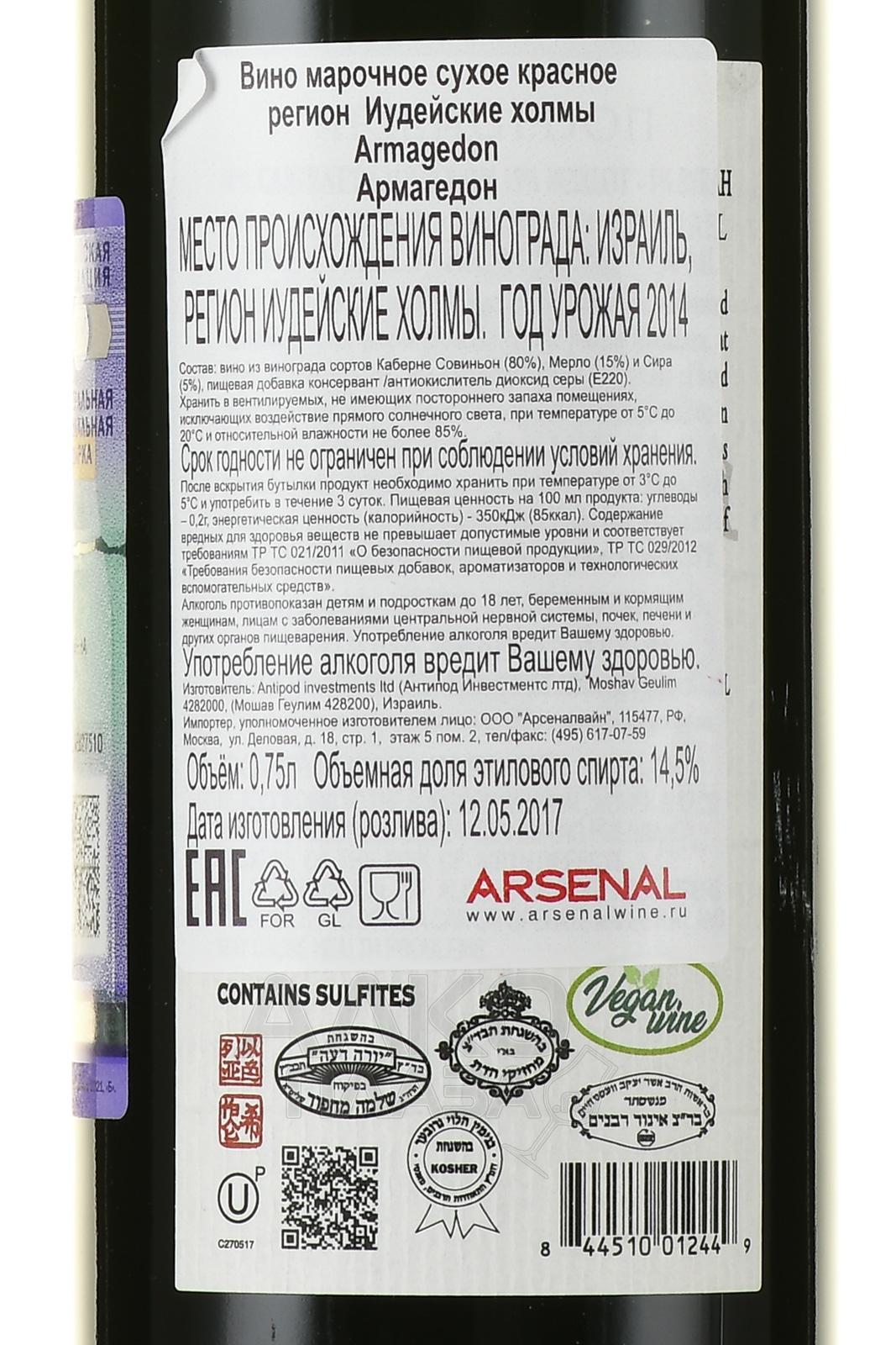 Красное сухое вино Armagedon 2014 год 0,75 л — кошерный алкоголь гарантированного качества, выпущенный в Израиле, регионе Иудейские Холмы с мягкими климатическими особенностями. Сбор винограда проводился в один сезон, он обрабатывался путем долгой ферментации в емкостях открытого типа и выдержки во французских дубовых барриках вместимостью 225 литров. Бутылка с вином комплектуется светлым деревянным футляром, а значит, спиртное можно рассмотреть на роль подарка.