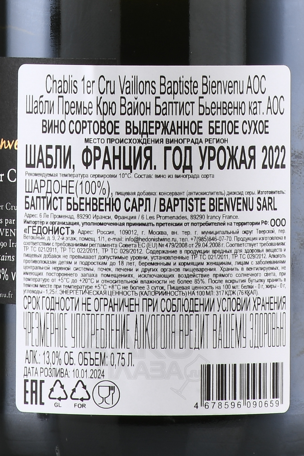 Baptiste Bienvenu Chablis 1-er Cru Vaillons - вино Баптист Бьенвеню Премье Крю Шабли Вайон 0.75 л белое сухое