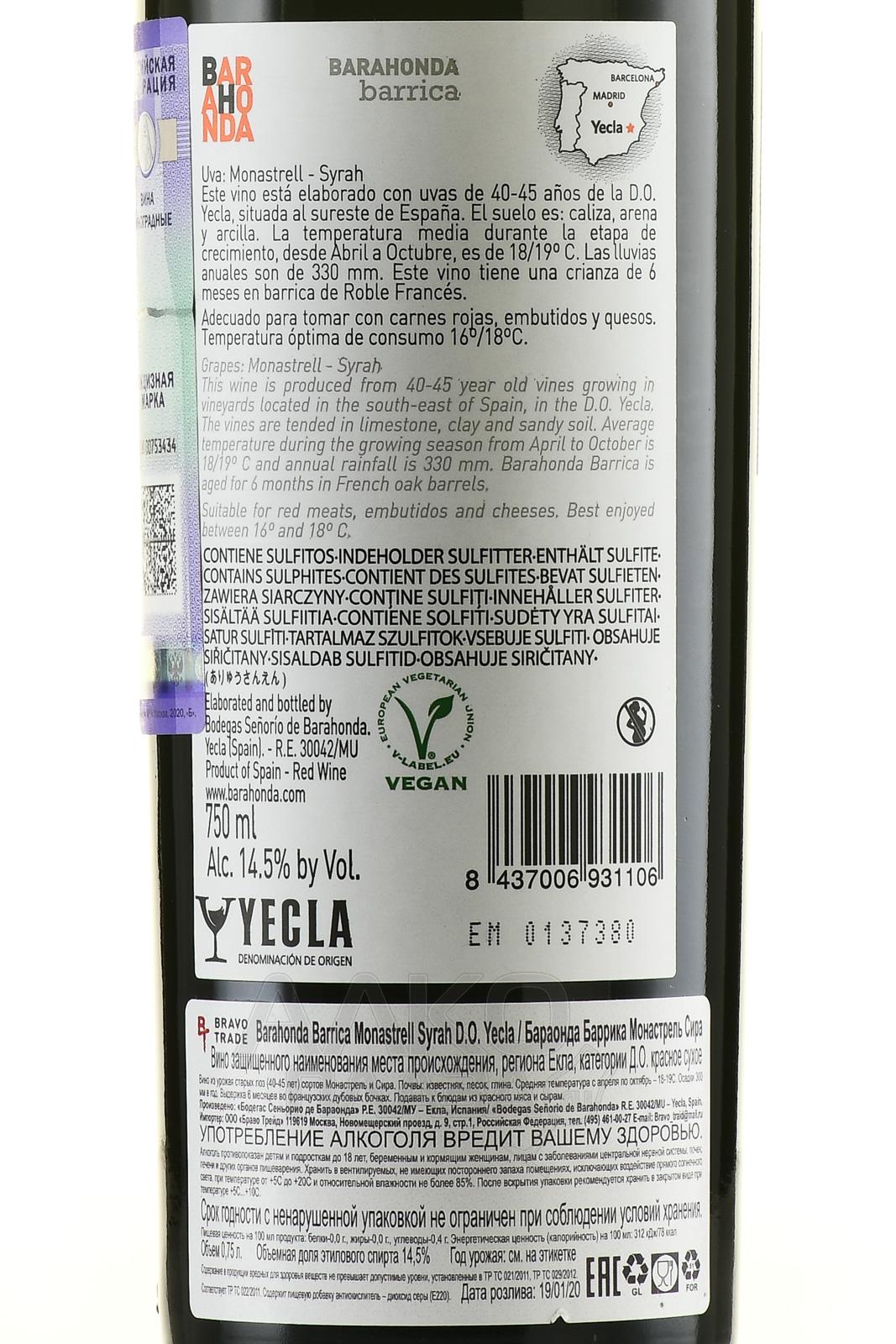Красное сухое вино Barahonda Barrica Monastrell Syrah 2018 год 0,75 л изготовлено в испанской юго-восточной местности Йекла из винограда двух сортов, собранных в один год с лоз возрастом 40-45 лет. Почвы данной местности составлены глиняными, песчаными и известняковыми породами. Винификация протекала по стандартному методу, выдержка сроком полгода проводилась во французском дубе.