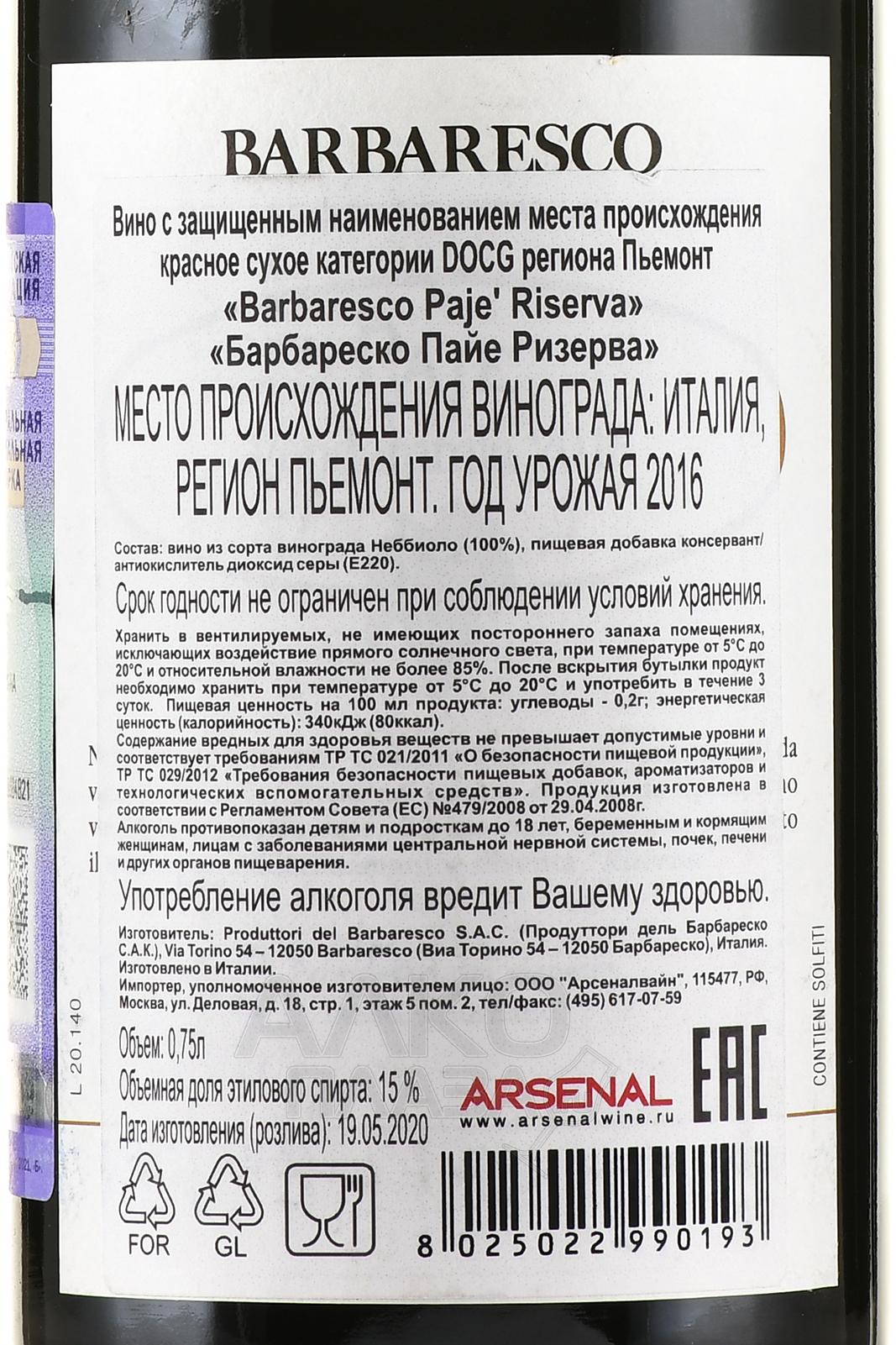 Производство: виноград из которого было произведено вино выращен на винограднике Пайе в районе Барбареско. В составе почвы в основном глина и известняк. Выдержка производилась в дубовых бочках в течение 36 месяцев и в бутылках в течение 9 месяцев. Произведено 10000 бутылок.