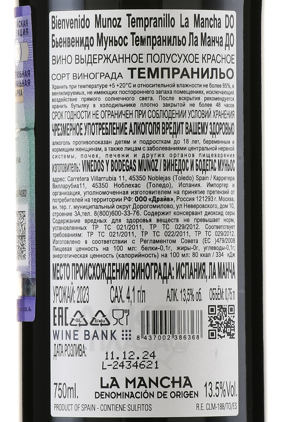 Bienvenido Munoz Tempranillo La Mancha DO - вино Бьенвенидо Муньос Темпранильо Ла Манча ДО 0.75 л красное полусухое