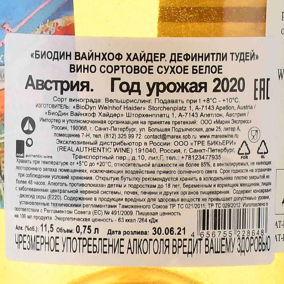Белое сухое вино BioDyn Weinhof Haider Definitely today 0.75 л — качественный биодинамический моносепажный напиток Австрии из региона Бургенланд, изготовленный из винограда Вельшрислинг, который поспел на лучших плантациях производителя, имеющего сертификаты биодинамики и органики. В спонтанной ферментации применяются дикие дрожжи. Бутилирование белого сухого вина проходит без фильтрации и серы. Пик развития напитка — между 2024-2027 годами, а при правильном хранении он может и дальше развиваться.
