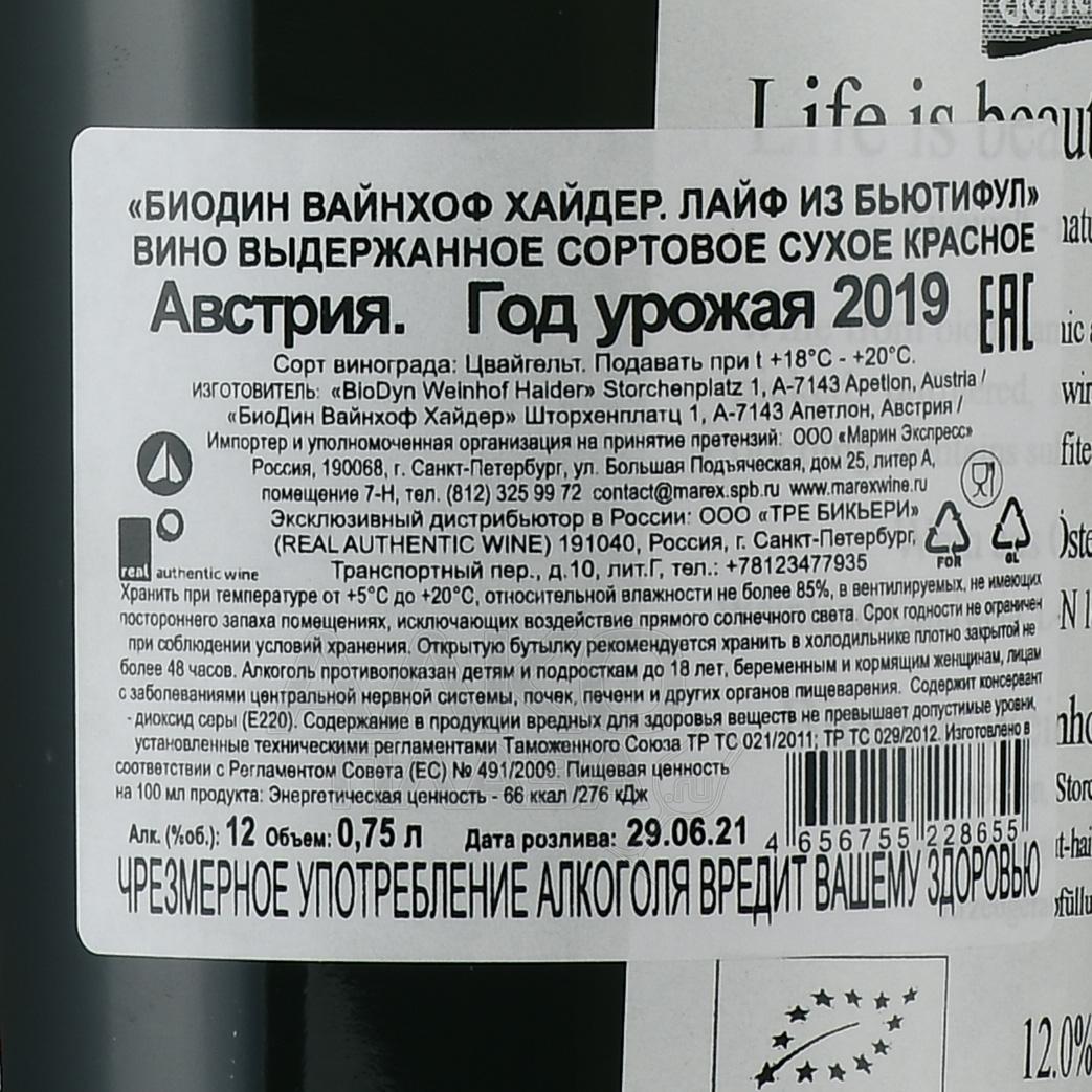 Красное сухое вино BioDyn Weinhof Haider Life is beautiful 2019 г. 0,75 л представлено в ассортименте немецкого хозяйства, функционирующего в соответствии с принципами биодинамики. Основой разновидности стал виноград определенного периода сбора, достигший необходимой спелости. Ферментация протекала естественным образом, в этом процессе участвовали дикие дрожжи. Розлив 12-градусного вино осуществился без фильтрации и применения консервантов. Развитие его вкуса в бутылке будет продолжаться до 2026 года.