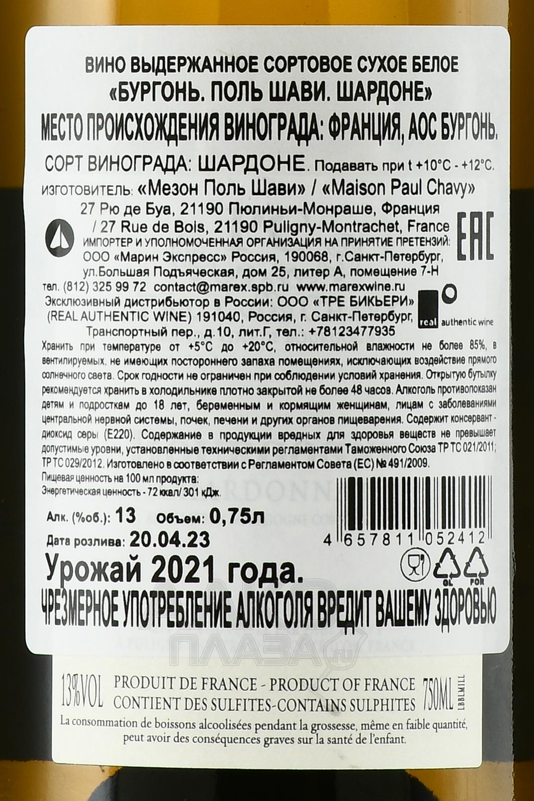 Белое сухое вино Bourgogne Chardonnay Paul Chavy 2021 год 0,75 л выпущено в рамках авторского проекта француза Поля Шави, который является потомственным виноделом. Хозяйство располагается в Бургундии и применяет как сырье виноград с собственных плантаций, имеющих хороший дренаж благодаря составу с высоким содержанием каменистых пород. Спиртное изготовили из ягод Шардоне со зрелых лоз, собранных на протяжении 2021 года. Сусло прошло мацерацию и сбраживание в металлических емкостях, после чего осуществилась 11-месячная выдержка в бочонках повторного наполнения. Еще вино 7 месяцев вызревало в стальных чанах. Потенциал хранения этого изысканного экземпляра оценивается экспертами в пять-восемь лет.