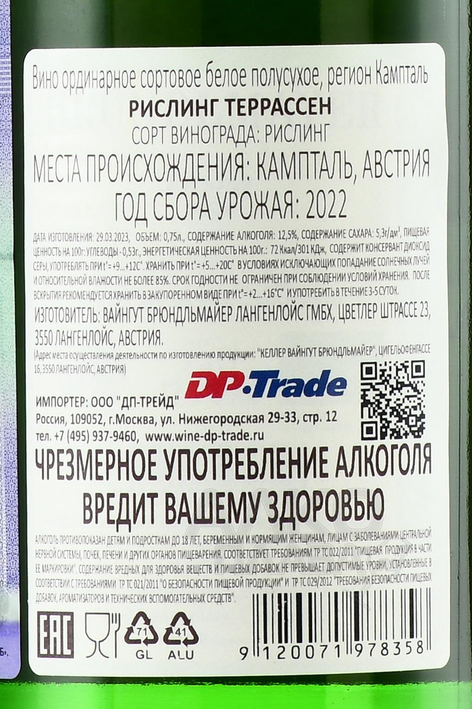 Белое полусухое вино Brundlmayer Riesling Terrassen 2022 год 0,75 л — высококлассный сортовой напиток австрийского происхождения, представленный в рамках моносепажной категории благодаря составу из винограда одного сорта с каменистых участков Кампталя (их высота достигает трехсот метров над уровнем моря). Состав сформирован ягодами одного урожайного года, обработанными в соответствии с методикой контролируемой ферментации в стальных емкостях. Для выдержки на тонком дрожжевом осадке применялась нейтральная тара.
