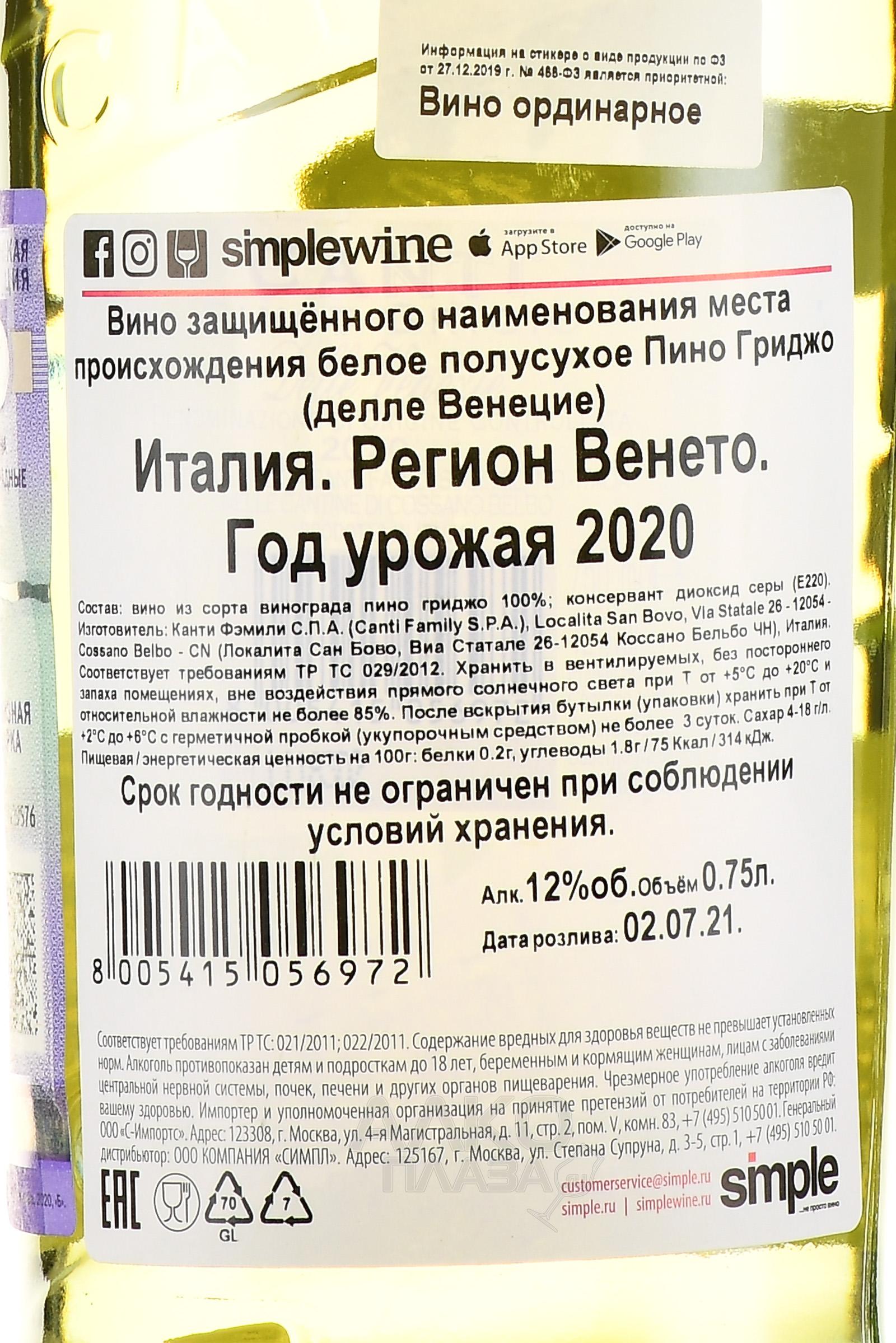 Белое полусухое вино Canti Pinot Grigio 0,75 л - является образцом всеми любимого итальянского Пино Гриджо. Во время производства вино не контактирует с дубовой бочкой что позволяет сохранить его интенсивную ароматику и мягкий вкус. Вино разливают фигурную бутылку что позволяет ей выделяться на полке.